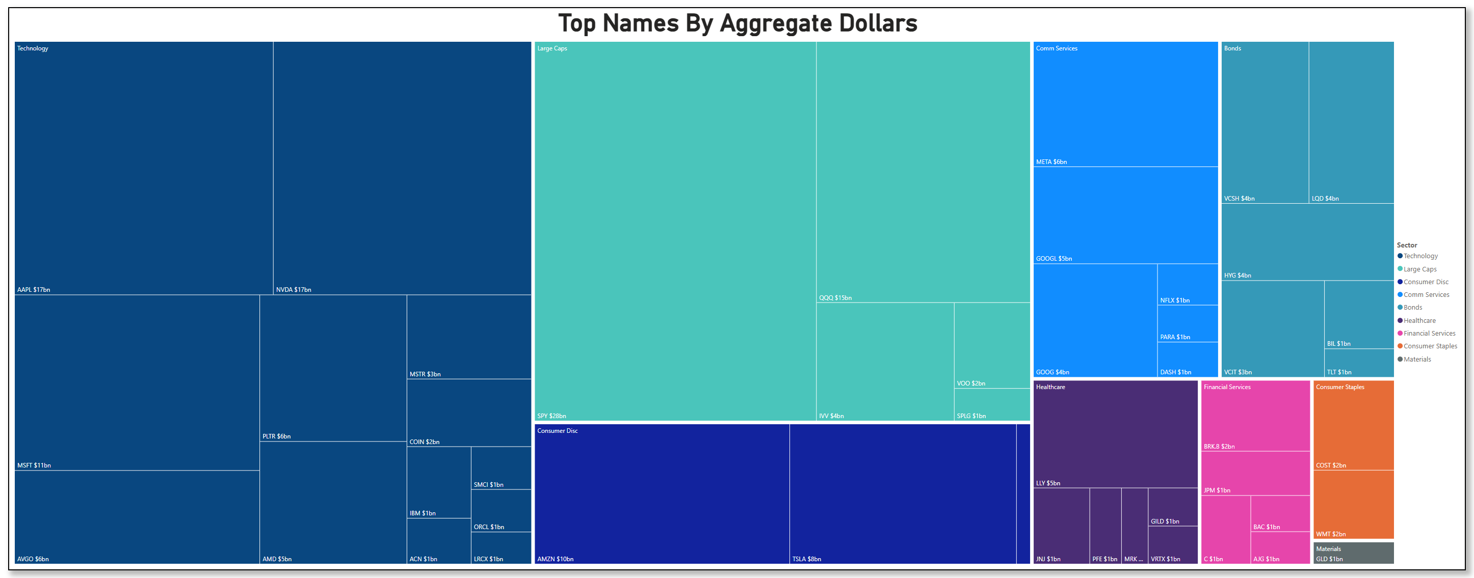 By name, the treemap and top‑30 flows read like a who’s‑who of liquidity provisioning. SPY sat on top, with QQQ not far behind. Inside single‑names, AAPL and NVDA were neck‑and‑neck for aggregate dollars, with MSFT, AMZN, and TSLA rounding out the usual gravity well. Communication Services flow clustered in META and the GOOG/GOOGL pair; Health Care attention centered on LLY; in Financials, BRK.B plus the money‑center trio stayed present; in Staples, COST and WMT showed up enough to matter. On the bond side, VCSH/VCIT/LQD/HYG/TLT/BIL all printed meaningfully—broad duration and credit tweaks rather than a one‑factor bet.