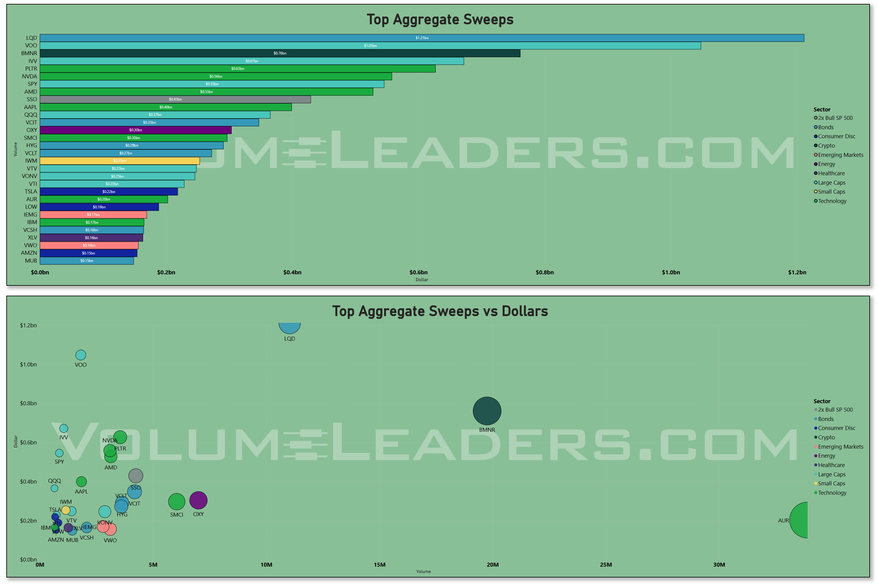The sweeps tape adds texture on urgency. The week’s largest sweep notional concentrated in LQD and broad beta wrappers (VOO), with additional size in SPY/QQQ and a handful of high‑beta tech tickers (NVDA/AMD/PLTR/AAPL) plus a splash of Energy (OXY) and AI‑hardware adjacents (SMCI). Net‑net, when someone needed to move fast, they did it in investment‑grade credit and index beta first—consistent with hedging, cash‑equitization, or rebalance mechanics—then reached for a short list of volatile single‑names when they wanted idiosyncratic exposure.