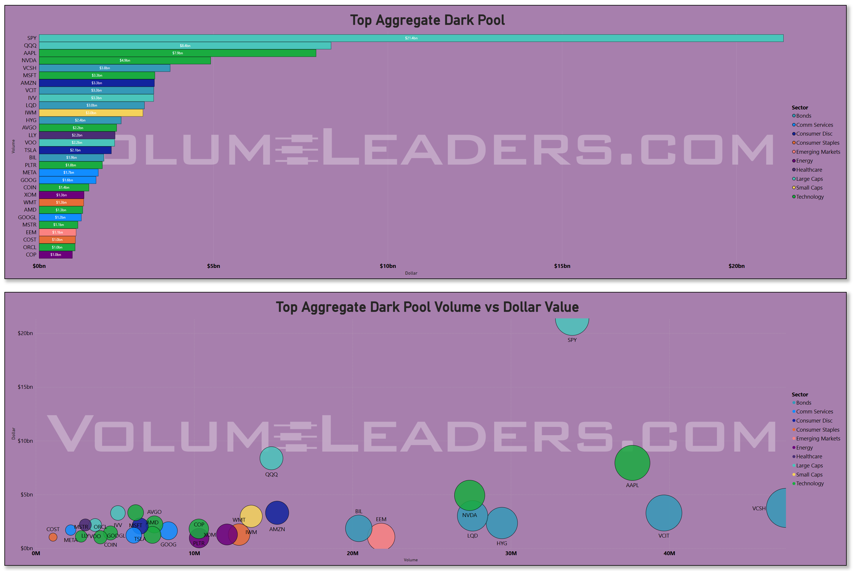 Unlit venues were busy exactly where you’d expect larger programs to hide their footprints: SPY dominated dark‑pool dollars, with QQQ/AAPL/NVDA/MSFT/AMZN next in line, and a notable presence from bond ETFs (VCSH/VCIT/LQD/HYG) plus cash‑like wrappers (BIL). That mix is classic for portfolio‑level positioning: index overlays, megacap liquidity hubs, and credit/treasury sleeves adjusted off‑exchange to minimize signaling.