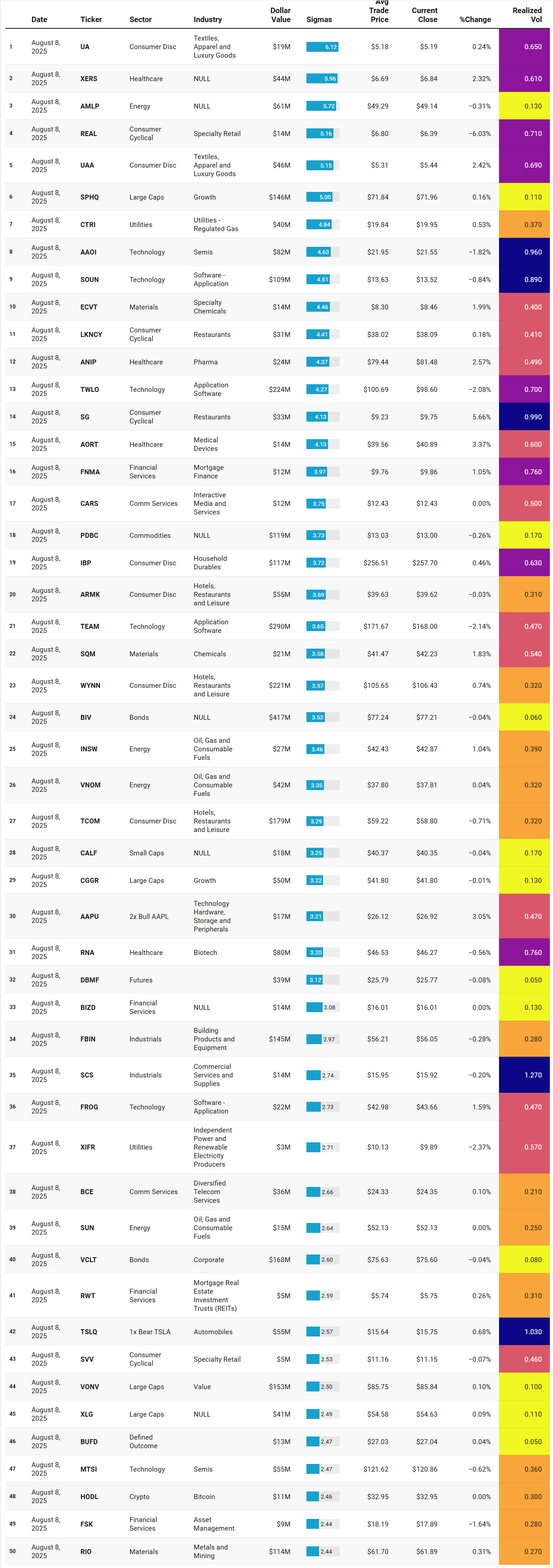 Institutional Outliers is a proprietary metric designed to spotlight trades that significantly exceed a stock’s recent institutional activity—specifically in terms of dollar volume. By comparing current trade size against each security's recent normalized history, the metric flags outlier events that may indicate sudden institutional interest but may be missed because the activity doesn’t raise any flags/alerts when comparing the activity against the ticker’s entire history. For example, it’s conceivable that a ticker today receives the largest trade it has had in the last 6 months but the trade is unranked and would therefore be missed by current alerts built off Trade Ranks. Use “Realized Vol” to identify tickers with large price displacement and to size your risk appropriately.