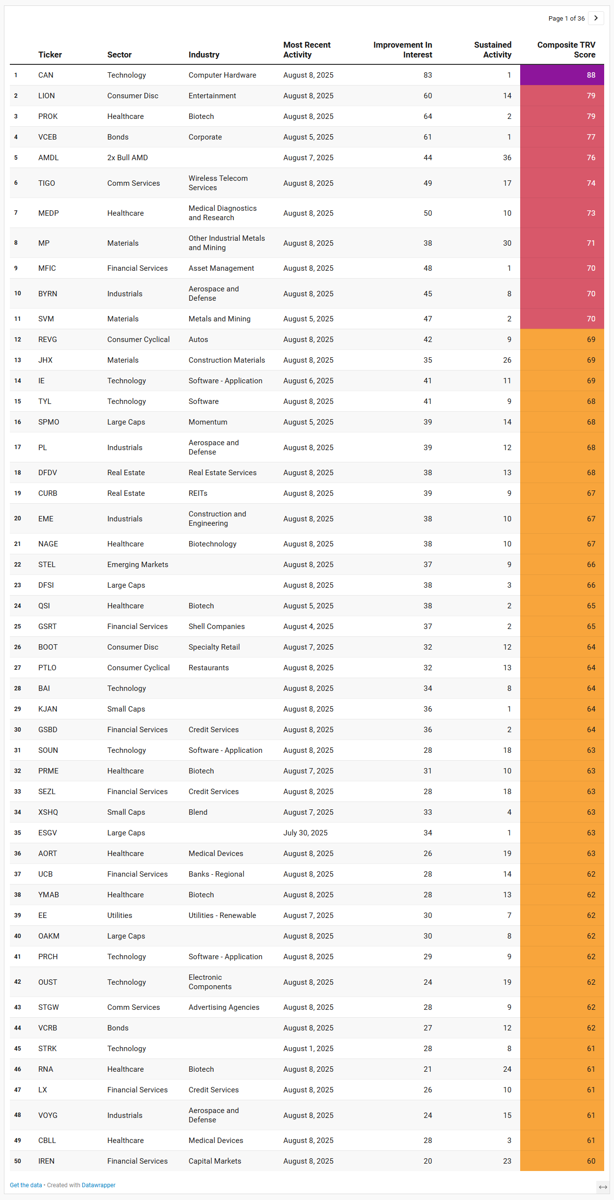 TRV is a proprietary metric that measures the recent acceleration or deceleration in institutional trading activity for a given stock by comparing its average trade rank over the past few days to its average in recent weeks. A sharp improvement in TRV typically reflects a notable shift in positioning, often accompanied by sustained trade activity, suggesting institutions are actively engaging with the name and that intensity of activity is rising. This often precludes meaningful price or narrative shifts. This isn’t a buy-list or sell-list; it’s meant to draw your eyes to names where institutions are putting money to work.