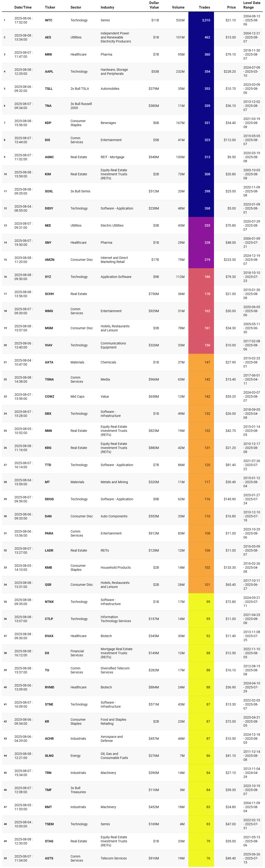 Technology is heavily represented, and not just in the mega-cap index drivers. We’ve got semis like INTC, SOXL, TSEM, and AAOI; software names such as AAPL, DIDIY, XYZ, DBX, TTD, DDOG, NTNX, CTLP, STNE; and infrastructure/communications equipment in VIAV and ASTS. That’s a broad cross-section of the tech complex, suggesting a lot of high-traffic price interaction in both hardware and software subsectors. When this many tech names are sitting at their historical volume peaks, it can mean institutions are using these zones as major inventory transfer points — places where positions get handed off, built, or unwound in size.