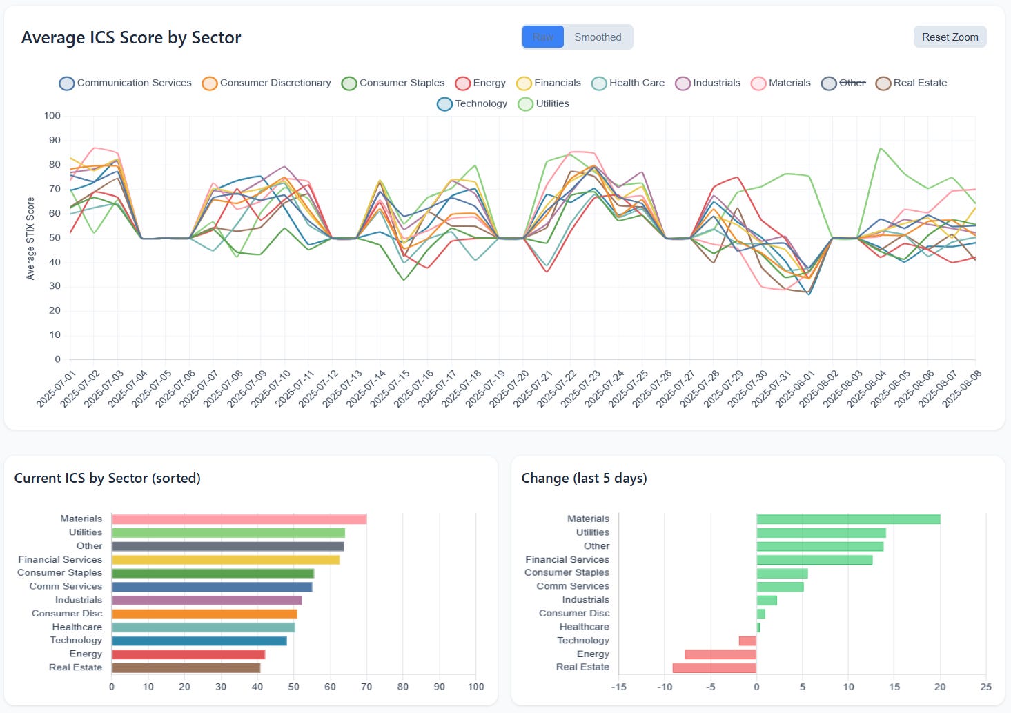 ICS rotation is the most interesting tell. On a level basis, Materials and Utilities now sit at the top of the conviction stack, with Financials, Staples, and Comm Services in the next tier; Tech and Health Care are middling; Energy and Real Estate trail. On momentum, the last five days show rising conviction in Materials and Utilities (largest positive delta), steady improvement in Financials/Staples/Comm Services, and mild deterioration in Technology, with Energy and Real Estate weakening further. Read together with the dollar flows, this looks like quiet re‑balancing: money kept the tech/liquidity engines humming, but conviction rotated toward defensives and Materials, while cyclicals tied to rates and property stayed out of favor.