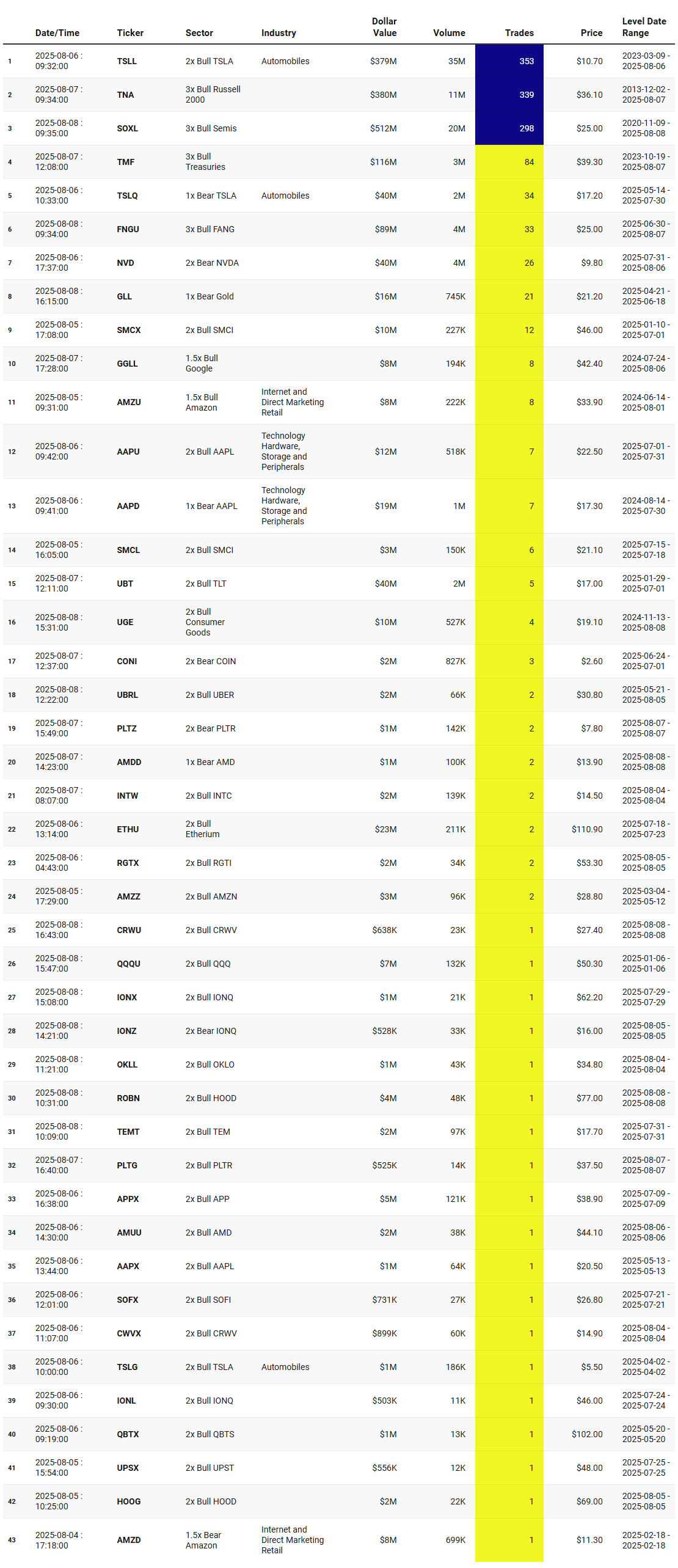 These are the most frequently traded #1-Ranked Levels in VL this week. Trades occurring at the highest volume price in a ticker’s history are significant because they represent institutional engagement at a key price memory level—where the market once found consensus. These areas act as liquidity hubs, enabling large players to transact efficiently, and often signal a reassessment of fair value. This activity may precede major moves, mark equilibrium zones, or reflect broader portfolio shifts, making these price levels important to watch even without yet knowing how price will resolve.