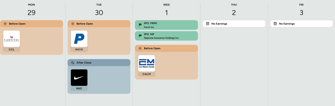 We close the month and quarter on Tuesday, with a government shutdown deadline at midnight the same day. The data focus shifts squarely to labor: JOLTS, ADP, Challenger, weekly claims, and Friday’s nonfarm payrolls will anchor the narrative. ISM prints, final PMIs, and Pending Home Sales are also due. Fed speakers will remain active, particularly early in the week. Internationally, China PMIs and European CPIs are on deck, with rate decisions from Australia and India. The earnings tape is lighter, but Nike, Carnival (CCL), and ConAgra headline, with Jefferies Financial Group (JEF) providing an off-cycle read on financials. For 9/29/2025 specifically, the docket includes Carnival Corp (CCL), IDT Corp (IDT), Jefferies Financial Group Inc (JEF), Lionsgate Studios Corp (LION), Progress Software Corp (PRGS), ReposiTrak Inc (TRAK), and Vail Resorts Inc (MTN).