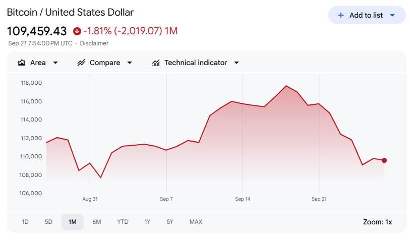 Crypto faced broad selling. Bitcoin fell roughly -5%, broke below the 100-day moving average around ~111.5k, but held above the early-September low just over ~107k. A break of that level would open a path toward the 200-day moving average near ~102k.