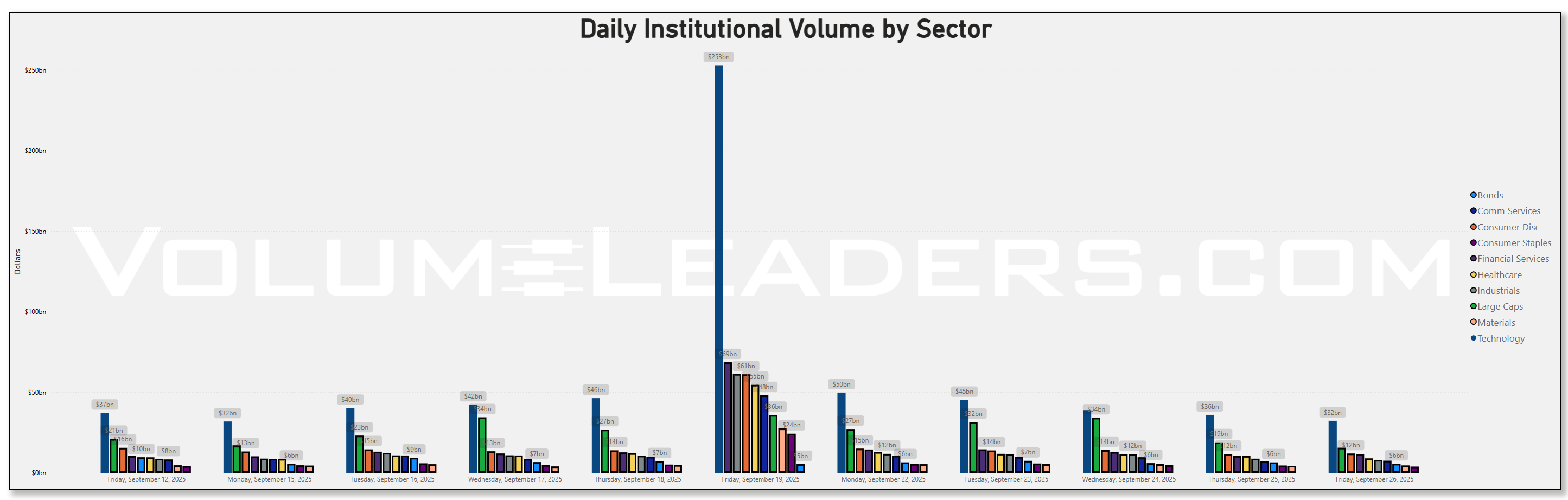 Against that backdrop, daily sector dollars this week showed tech consistently anchoring the tape with roughly $50b Monday, $45b Tuesday, $34b Wednesday, $36b Thursday, and $32b Friday. Large-cap equity allocations sat right behind that tech backbone. Consumer discretionary and Fins took turns in the next 2 slots, with Healthcare and Industrials not far behind. The contrast with the prior week’s expiration day was stark and that week-over-week change is classic post-OPEX cooling: the baseline stayed healthy, but the cross-sector froth faded with the derivatives calendar. The directional takeaway is that allocation flows remained present, yet the absence of another structural catalyst kept daily dollars in a tighter band.