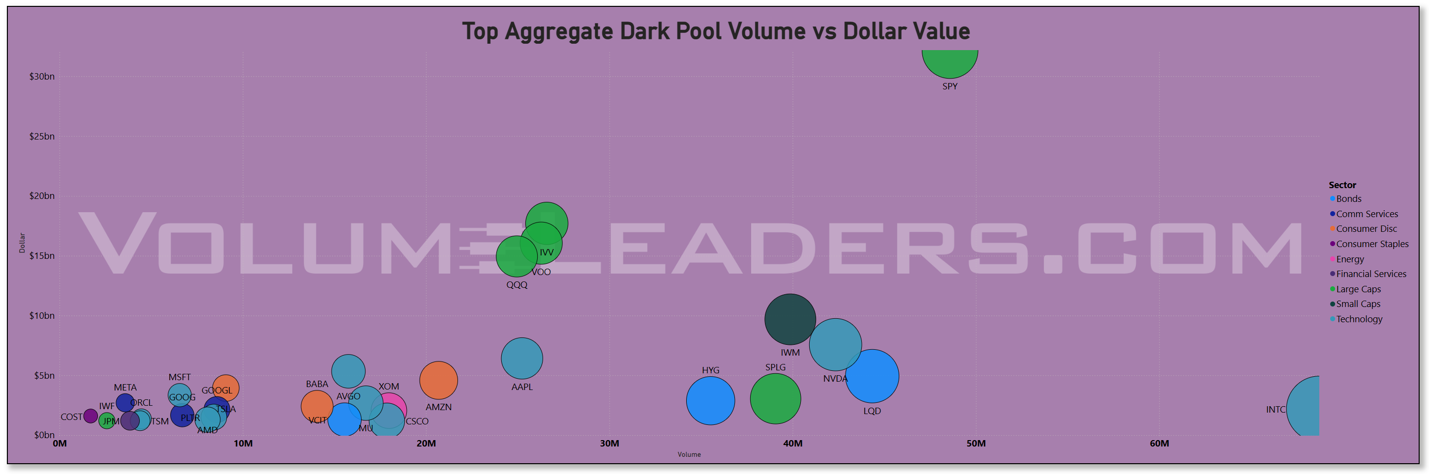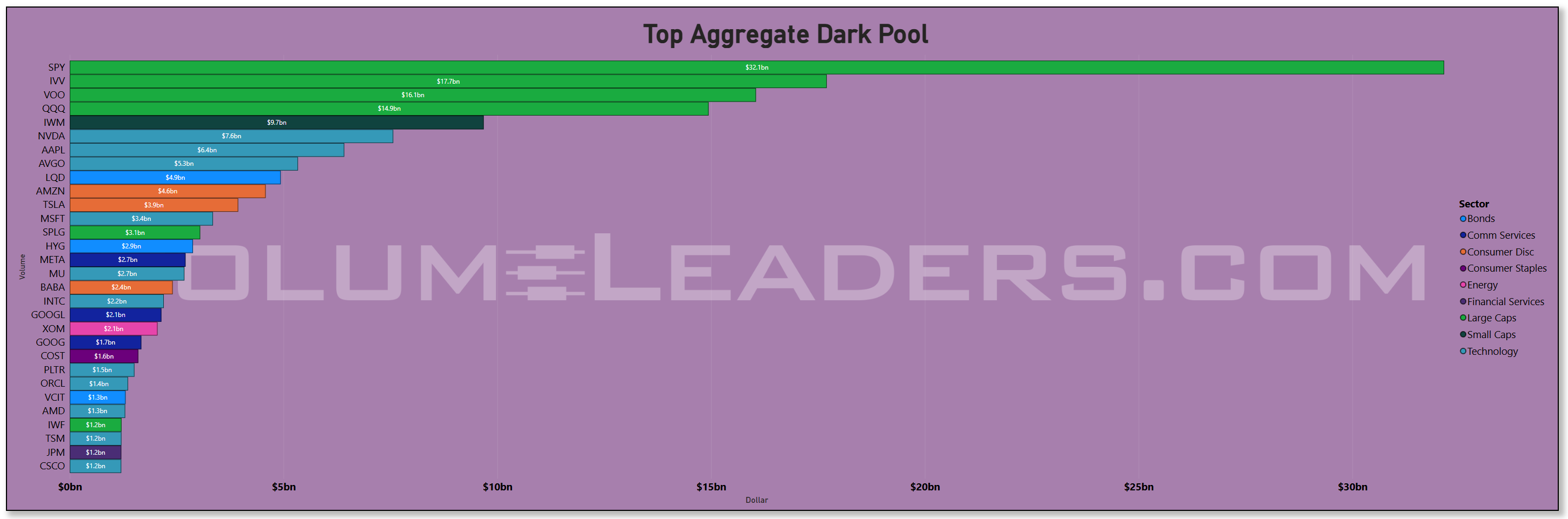 The dark-pool lens sharpened the picture. Off-exchange dollars were heaviest in the same index complex—SPY about $32.1b, IVV $17.7b, VOO $16.1b, QQQ $14.0b—followed by IWM at ~$9.7b. Among single names, NVDA’s ~$7.6b and AAPL’s ~$6.4b led, with AVGO ~$5.3b, AMZN ~$4.6b, TSLA ~$3.9b, and MSFT ~$3.4b close behind. LQD and HYG also showed meaningful dark prints near $4.9b and $2.9b respectively. When broad index trackers dominate the dark tape this way, it usually signals scheduled allocation and risk-transfer rather than outright chase; the consistent presence of mega-cap tech in the same venue suggests ongoing institutional inventory management, i.e., add on weakness and trim on strength without advertising size. The appearance of IWM near the top of dark activity is notable: small caps may not have led on the lit tape, but the off-exchange footprint implies real hands are engaged at key levels.