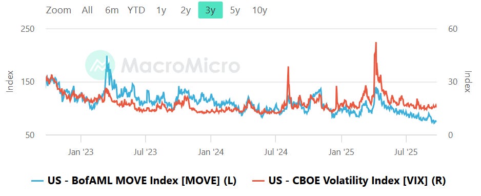Both curves remain subdued relative to last year’s peaks. MOVE has cooled meaningfully from the 2023 spikes and trends sideways to lower, while VIX sits in a low-teens regime with only brief upticks. There is no glaring divergence at the moment; bond vol is not screaming stress ahead of equities, and equity vol has not decoupled on the upside. The main tripwire would be a MOVE surge north of roughly 120 while VIX stays sleepy, which often precedes equity weakness, or a VIX break into the high teens to low 20s that would signal a shift from orderly pullbacks to disorderly selling.