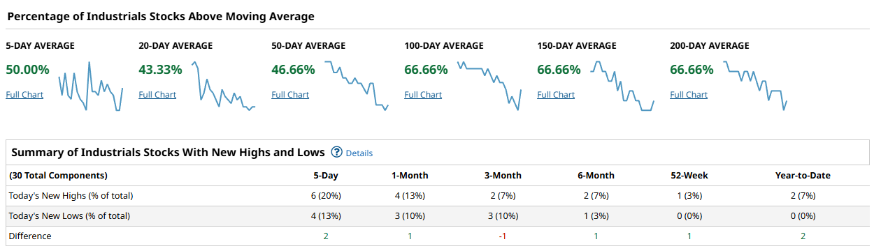 The Dow read as steady but not explosive. Only 50.00 percent are above the 5d and 43.33 percent above the 20d, with 46.66 percent above the 50d. The longer-term lines are stronger at 66.66 percent across the 100d, 150d, and 200d. Net new highs are slightly positive near term at +2 over 5 days and +1 over 1 month, slip to -1 over 3 months, and recover to +1 over 6 months, +1 over 52 weeks, and +2 year to date. That combination points to near-term chop inside a sturdier longer-term base, with cyclicals trying to reassert but defensives still doing a lot of the quiet work.