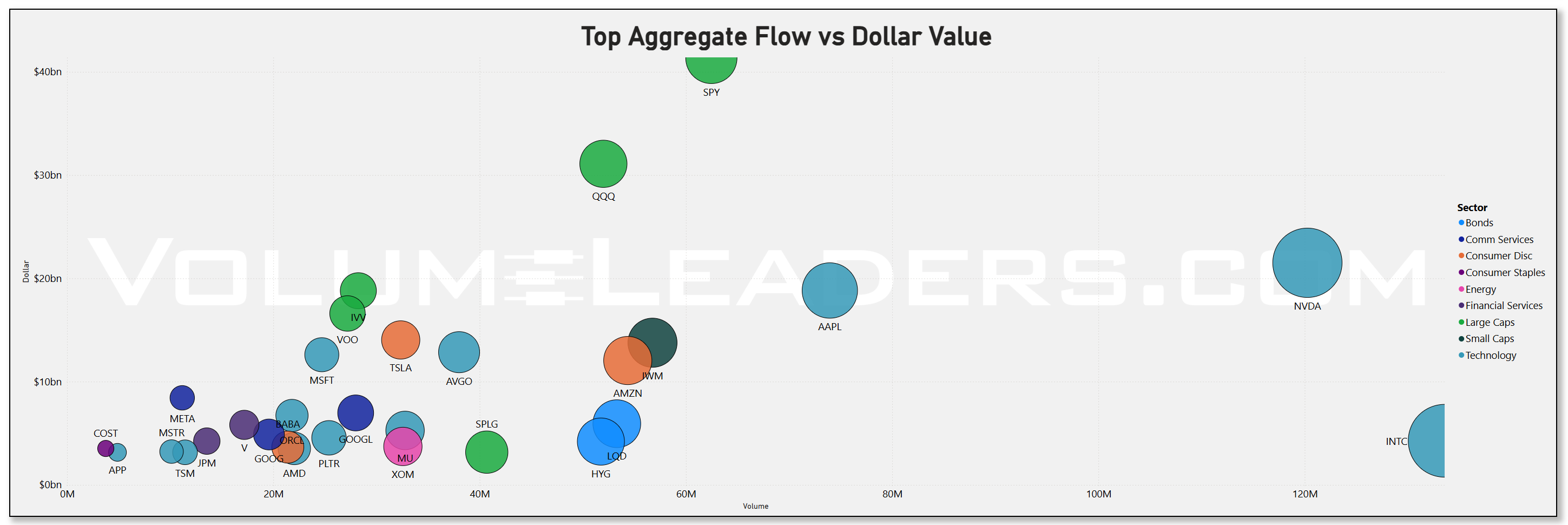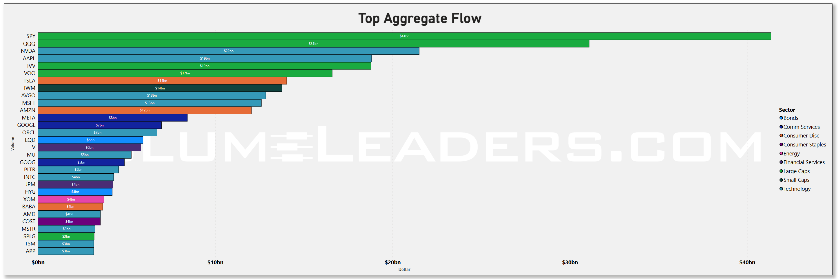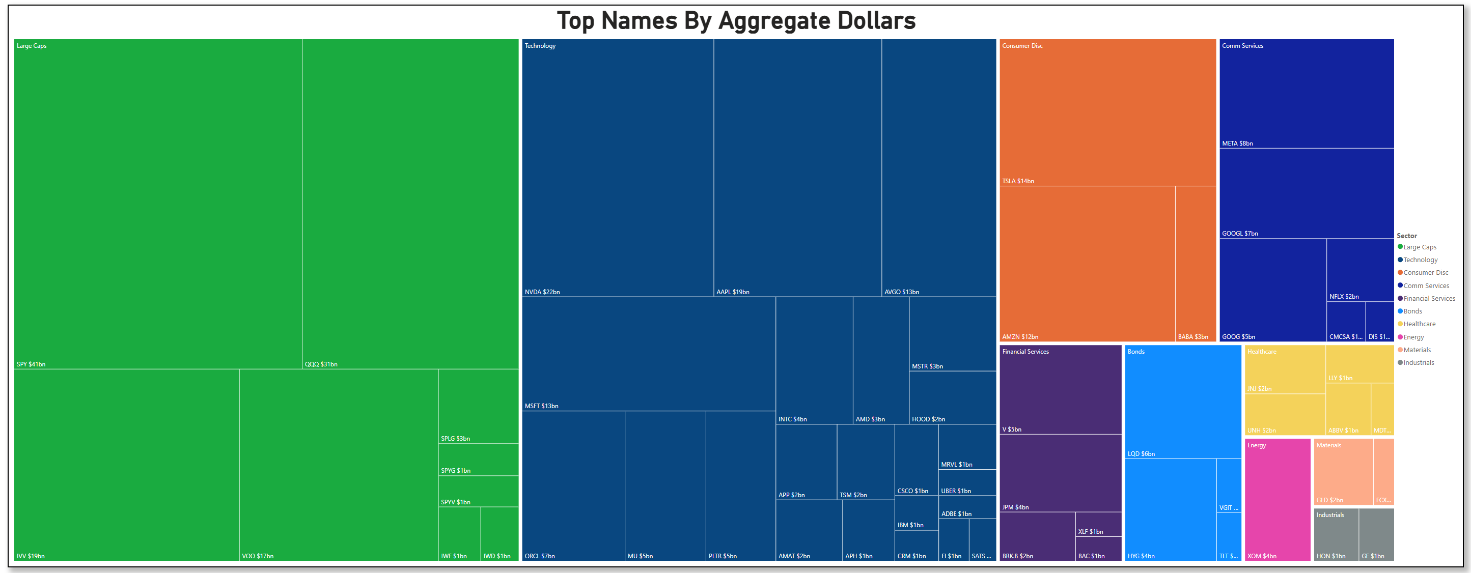 The treemap and aggregate bars make the leadership stack explicit. The top of the board was dominated by index beta: SPY hauled in about $41b, QQQ $31b, IVV $19b, and VOO $17b, with smaller satellites like SPLG around $3b and style tilts such as SPYG and SPYV near $1b each. Inside single-name Tech, NVDA printed roughly $22b, AAPL $19b, MSFT and AVGO about $13b each, then a second tier—ORCL ~$7b, MU and PLTR ~$5b, INTC ~$4b, AMD ~$3b—showing that breadth extended beyond the top two. Consumer Discretionary remained a two-engine cluster with TSLA near $14b and AMZN $12b, while Communication Services showed a healthy trio of META ~$8b and both GOOGL and GOOG around $7b and $5b. Credit sleeves stayed active as well, with LQD around $6b and HYG near $4b. That mix says institutions were still expressing the “index + AI barbell,” adding beta through SPY/IVV/VOO while keeping material singles exposure in the semis, big platforms, and a couple of discretionary leaders. Nothing about that distribution screams capitulation or FOMO; it reads like steady positioning with a growth tilt.