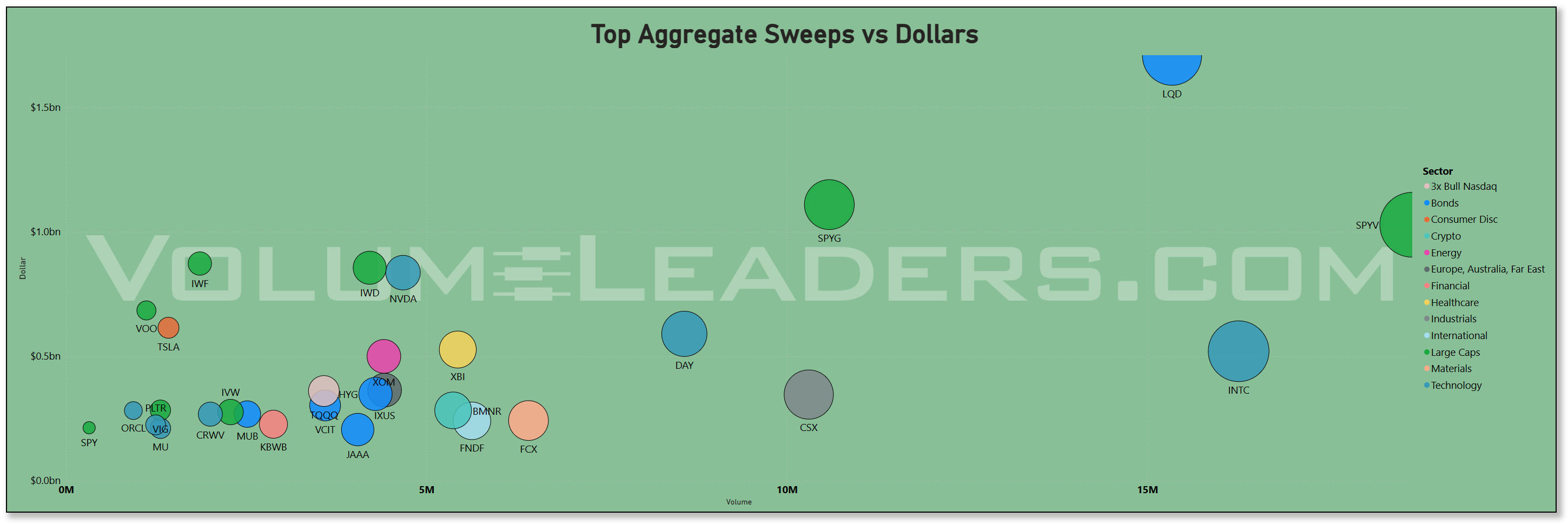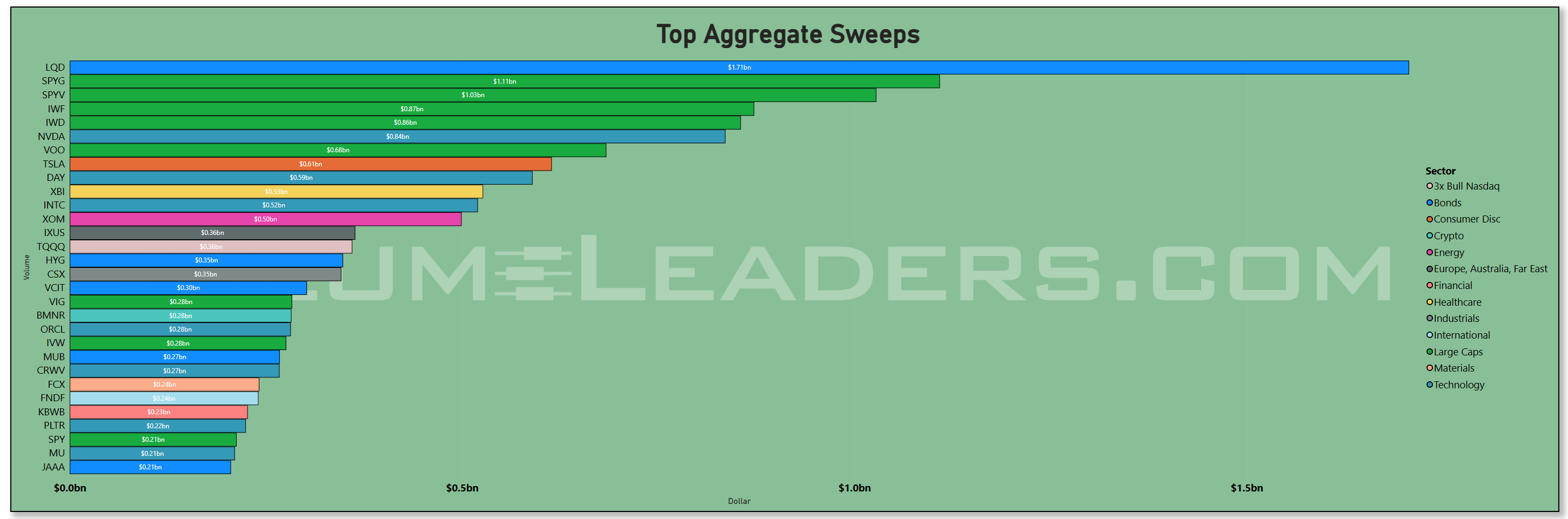 Sweeps told us where the fast money pressed its bets. The largest sweep dollars were in LQD as usual at roughly $1.71b, with style tilts right behind—SPYG about $1.11b and SPYV $1.03b—followed by IWF ~$0.87b and IWD ~$0.78b. That is a classic posture for macro funds toggling duration and equity style rather than whipping single names: lean into IG credit and keep both growth and value levers hot to manage factor risk. Among equities, NVDA (~$0.68b), VOO (~$0.68b), TSLA (~$0.61b), QQQ (~$0.53b), XBI (~$0.53b), INTC (~$0.52b), and XOM (~$0.50b) rounded out the chase list. The mix skewed barbell—AI leaders, a biotech breadth proxy, a mega energy bellwether, and index wrappers—consistent with traders seeking convexity around macro prints rather than calling a new trend.