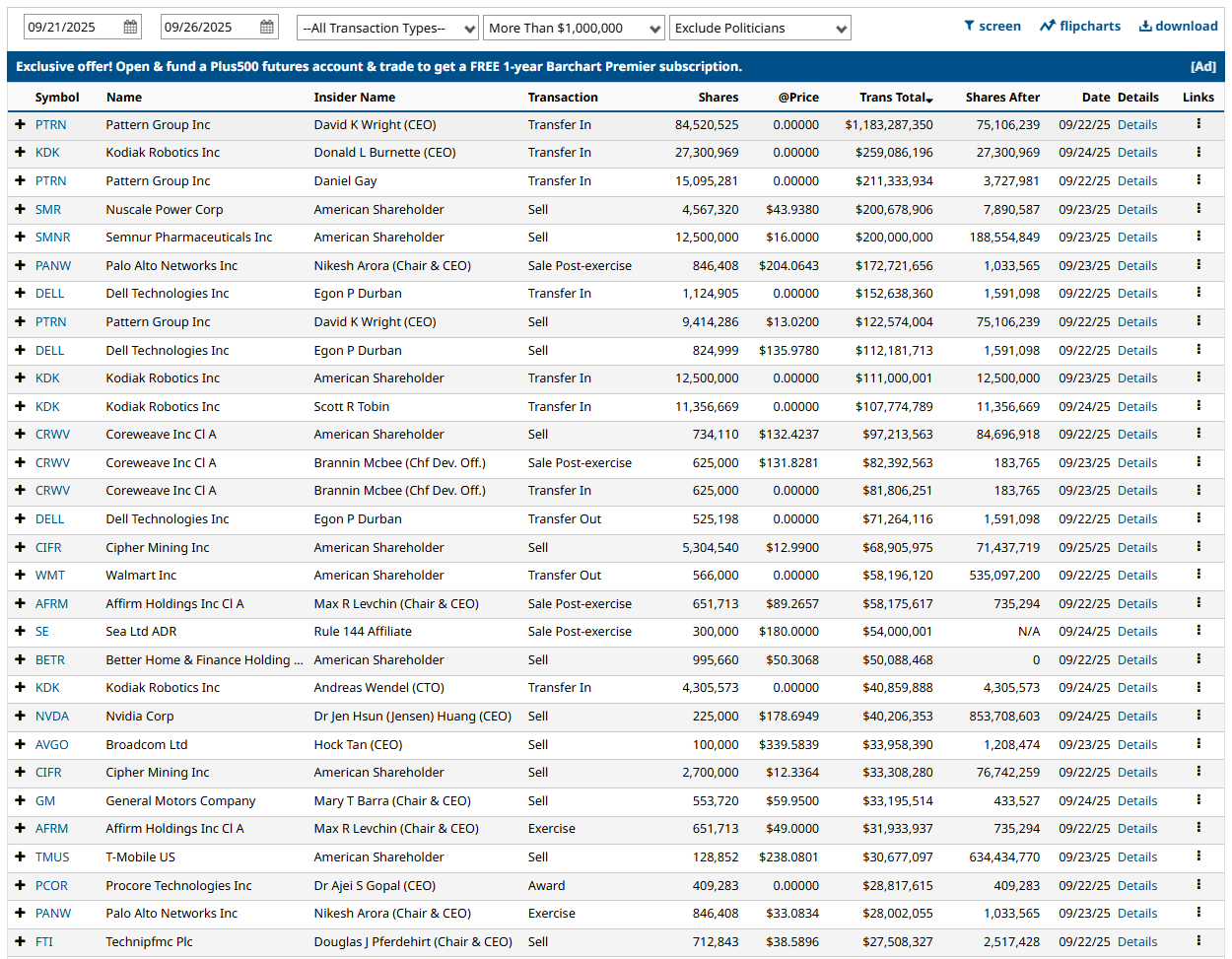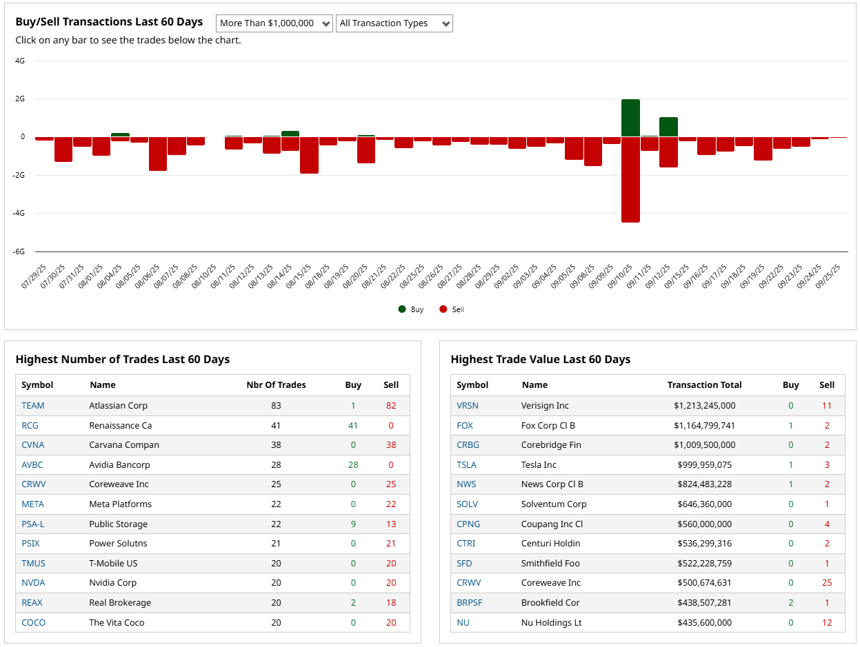 Insider flow over the last 60 days skews to distribution. The bar chart shows persistent net selling with only two brief buy spikes in mid-September and a large sell downdraft clustered the same week. By count, Atlassian (TEAM) posted 83 trades with 82 sells and 1 buy, Carvana (CVNA) logged 38 sells and no buys, Meta (META) 22 sells, Nvidia (NVDA) 20 sells, and T-Mobile (TMUS) 20 sells. Avidia Bancorp (AVBC) and Renaissance Capital (RCG) were notable accumulators with 28 and 41 buys, respectively, but they are smaller totals by value. On dollars, the tape is heavy: Verisign (VRSN) shows about $1.21B in sells, Fox class B roughly $1.16B with light offsetting buys, Corebridge (CRBG) near $1.01B in sells, Tesla (TSLA) just under $1.0B, Solventum (SOLV) about $646M, and Nu Holdings (NU) around $436M, while CoreWeave shows roughly $501M in sells. This week’s top tickets continue the pattern: Palo Alto Networks chair sold post-exercise about 846k shares for roughly $172.7M, Nvidia’s CEO sold 100k shares near $33.96M, Dell’s Egon Durban executed multiple sales north of $100M, NuScale printed a $200.7M sale, and several CoreWeave entries recorded sizable dispositions. Many entries are transfers or post-exercise sales, but open-market sells dominate the biggest tickets. Net read: insiders are distributing into strength. A persistent shift toward multiweek net buying across large caps would be required to flip this signal.