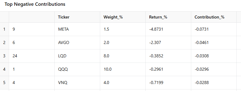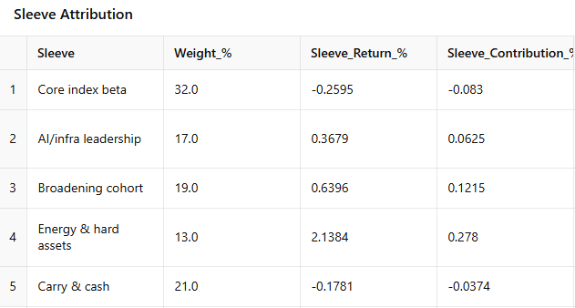 Carry and cash (21% weight) was a small ballast drag at about -0.04% contribution, roughly -0.18% sleeve return. It did what it is supposed to do during a mild risk-off skew in the week: keep volatility low while giving up a little relative performance. LQD slipped about -0.39% and the short-duration sleeves were flat to slightly negative.