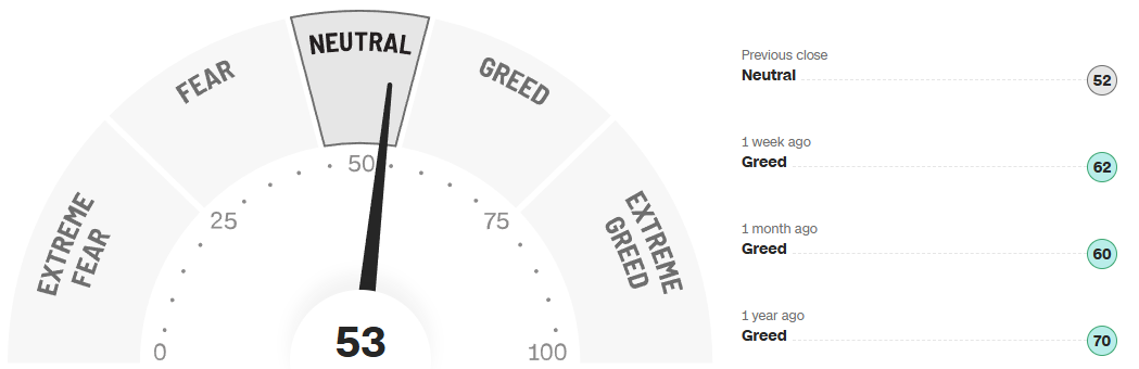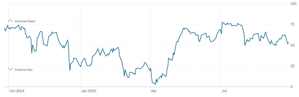 The composite reads 53, up from 52 at the prior close but down from 62 a week ago and 60 a month ago; one year ago sat near 70. The one-year path shows a migration from strong greed in spring to a midrange regime through late summer and early fall. With a 53 print, the market is neither washed out nor euphoric. A push toward the high 70s would flag momentum fatigue and a higher probability of negative asymmetry. A slide toward the low 40s or below would improve the prospective reward by resetting positioning and sentiment without requiring deep price damage.