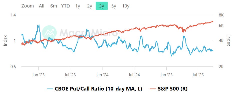 The 10-day average sits in a midrange zone, well off the fearful highs seen during episodic spikes and above the froth that followed summer rallies. In practical terms, that suggests hedging is present but not panicked, which tends to shallow drawdowns and reduce the odds of violent bear squeezes. The tripwires are straightforward. A drift down toward roughly 0.8 would flag complacency and raise risk of air-pocket selloffs. A rise back toward 1.0 to 1.1 would indicate growing caution and usually improves the quality and durability of subsequent bounces.