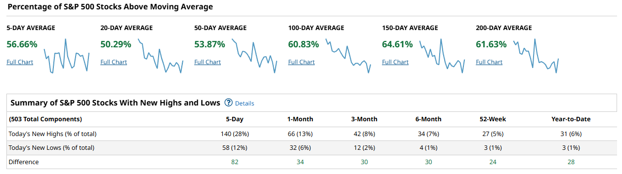 For the S&P 500, the short end firmed while the middle of the curve hovered just above neutral. The share above the 5d sits at 56.66 percent, the 20d at 50.29 percent, and the 50d at 53.87 percent. Longer measures are healthier with 60.83 percent above the 100d, 64.61 percent above the 150d, and 61.63 percent above the 200d. The new-highs minus new-lows spread is positive across lookbacks: +82 over 5 days, +34 over 1 month, +30 over 3 months, +30 over 6 months, +24 over 52 weeks, and +28 year to date. That mix says dips are bought and damage has been limited, but the 50d cohort still needs a stronger push to convert repair into trend.