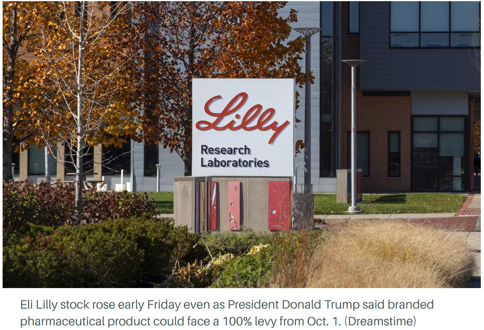 Pharmaceuticals will be subject to a 100% tariff on branded or patented imports effective October 1, 2025 unless the producer is actively building a U.S. manufacturing plant; generics are excluded. Because many majors already operate or are expanding U.S. capacity, the impact tilts toward a “win” for those with domestic footprints. The price action in Eli Lilly (LLY), Merck & Co. (MRK), AbbVie (ABBV), Pfizer (PFE), and Amgen (AMGN) reflects that assessment.