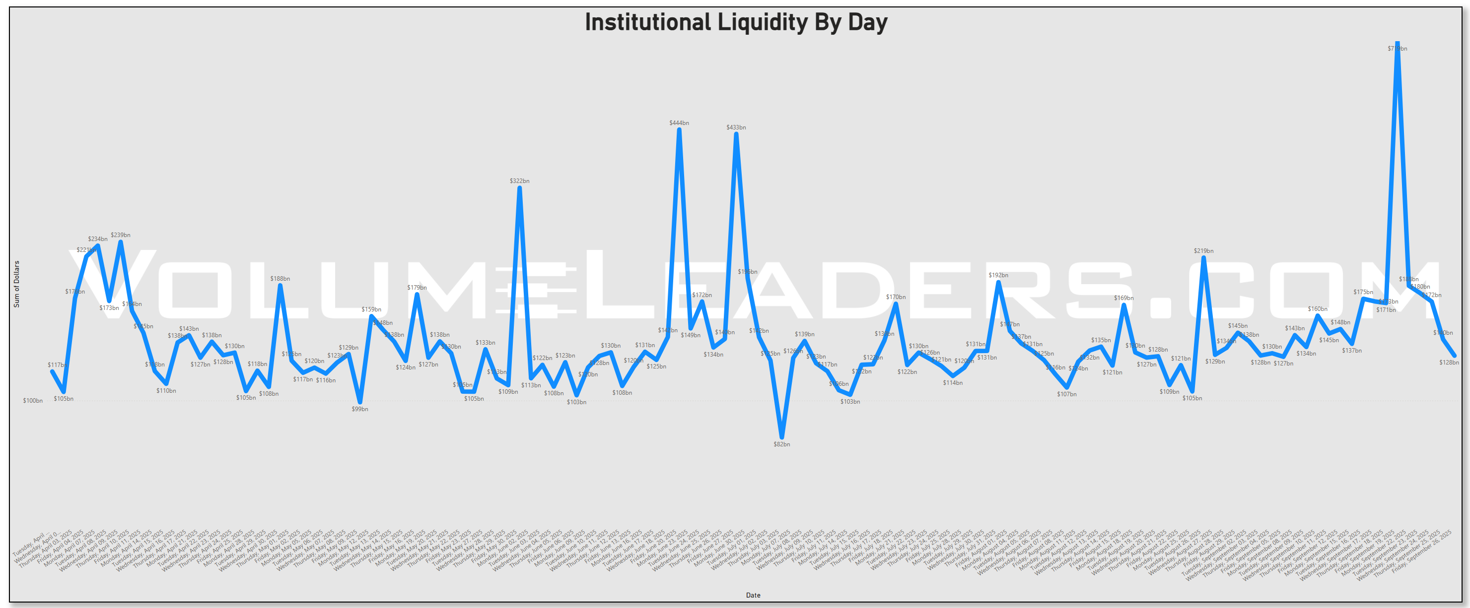 Liquidity told the story first. The Institutional Liquidity By Day series shows a towering surge to roughly $720b recently on triple witching and then a quick settle back into the $120b–$180b neighborhood, declining into week’s end. The rhythm is structural rather than directional: the giant bursts line up with known expiration and rebalance windows that routinely amplify notional turnover. Equity and index derivatives typically expire on the third Friday of each month, with the March/June/September/December “triple witching” sets producing the largest volume shocks as options and futures roll together. Those days are historically associated with heavy, program-driven prints and wider intraday ranges, not necessarily lasting trend signals. The calendar structure explains why the week following a major expiration often reverts toward baseline liquidity as dealers clean up residual hedges and passive flows normalize. The mechanics are well documented: monthly expiries cluster on the third Friday, and the quarterly “triple” runs drive outsized volume and rebalancing traffic. Liquidity is still elevated over summer troughs so we’re seeing the largest players still staking claims in different corners of the market.