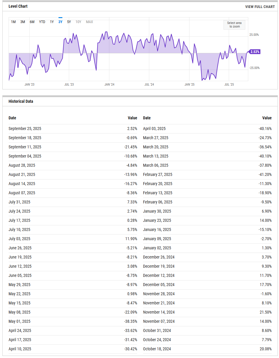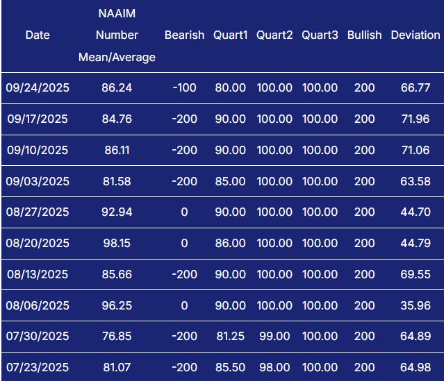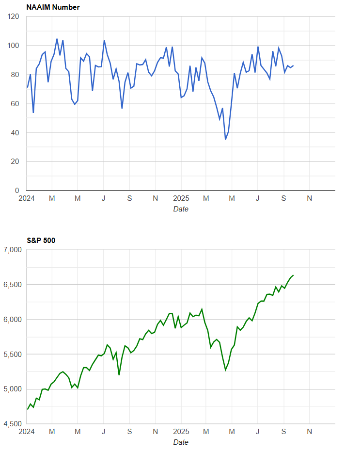 Active managers remain well invested. The latest print is 86.24 on September 24, essentially unchanged from 84.76 and 86.11 over the prior two weeks. That keeps exposure in the upper band of the year and implies limited dry powder if price backs off. The posture is constructive while trends are intact, but it makes the market more sensitive to negative catalysts. A slide toward the 50s without major price damage would mark a healthy reset and improve forward odds; a push back into the 90s would indicate full risk on and set up a sharper reaction to suprises.