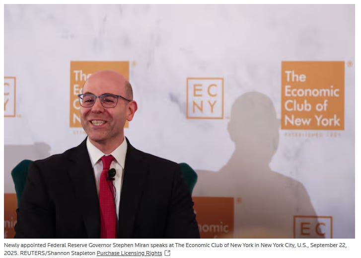 Fed speakers reinforced a cautious stance. The committee’s center of gravity continues to lean toward measured easing, but this week’s rhetoric added friction. Stephen Miran’s Monday speech at the New York Economic Club explained his dissident dot, arguing the policy rate should be at or just above neutral, and that the current setting risks the employment mandate; he prefers -50 bp increments given his assessment of r* (neutral), which he argued sits in the low-to-mid-2% range after adjusting for tariffs, population dynamics, rent inflation, regulation, and One Big Beautiful Bill.