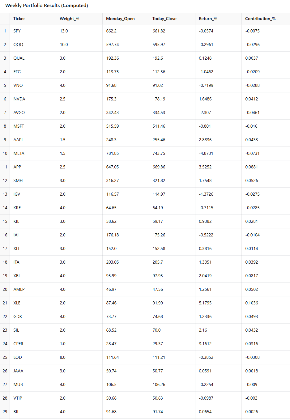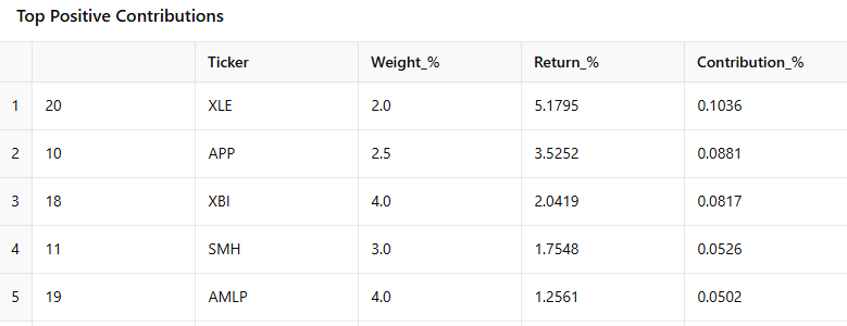 On single-name and ETF contributions, the top helps were XLE (+5.18% for +0.10% contribution), APP (+3.53% for +0.09%), XBI (+2.04% for +0.08%), SMH (+1.75% for +0.05%), AMLP (+1.26% for +0.05%), and GDX (+1.23% for +0.05%). The notable drags were META (-4.87% for -0.07%), AVGO (-2.31% for -0.05%), LQD (-0.39% for -0.03%), QQQ (-0.30% for -0.03%), VNQ (-0.72% for -0.03%), and KRE (-0.71% for -0.03%).