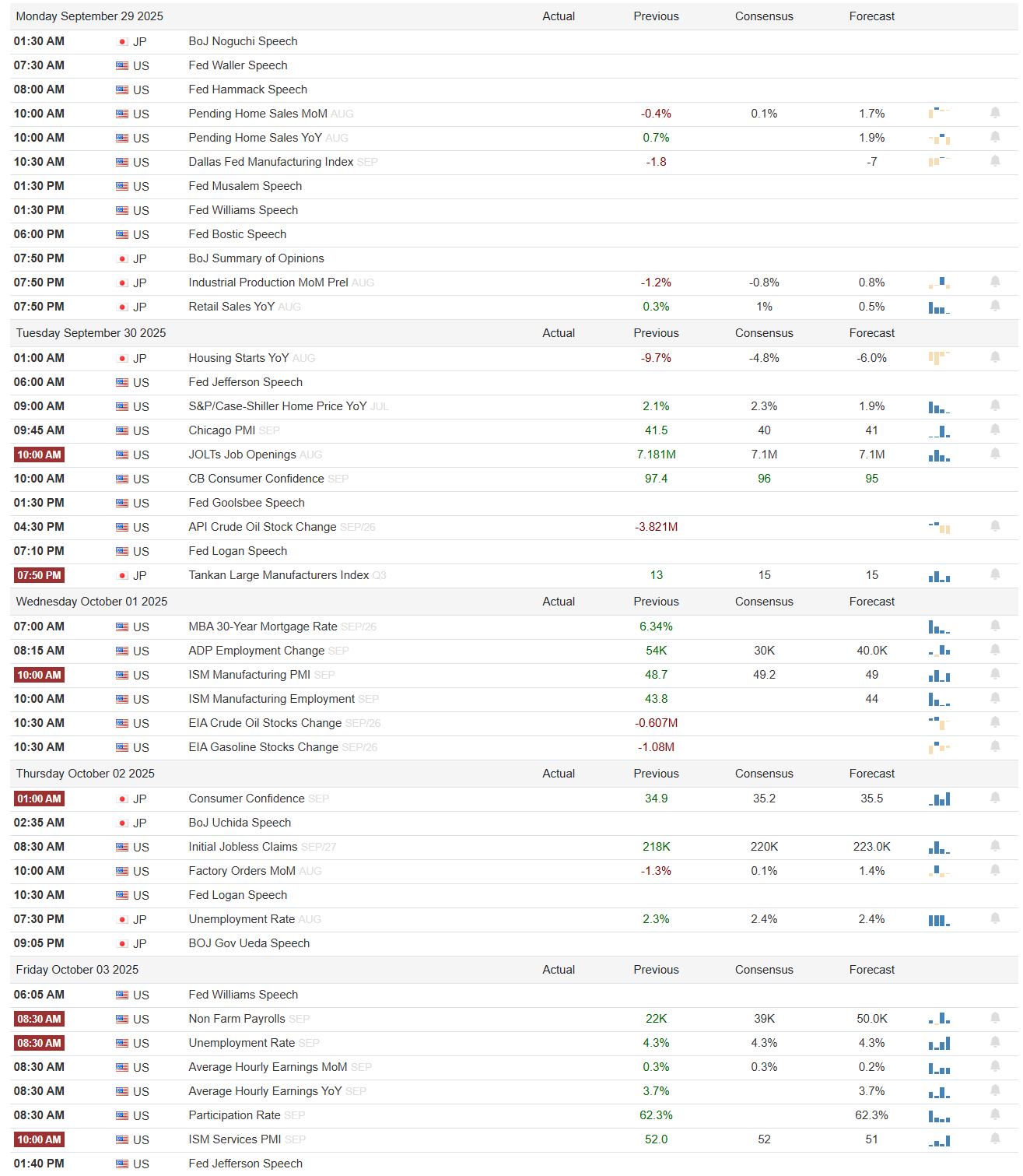 Policy and politics threaded through the tape all week. A potential government shutdown on October 1 remains a headline risk if Congress does not pass a spending bill. The White House’s late-Wednesday memo framed the stakes: a shutdown would trigger widespread dismissals of employees in programs that do not align with President Trump’s priorities. Markets, meanwhile, are pricing an 88% probability of a -25 bp cut at the October 28–29 FOMC meeting, suggesting investors still expect the easing cycle to proceed barring a major surprise in labor or inflation data before then.