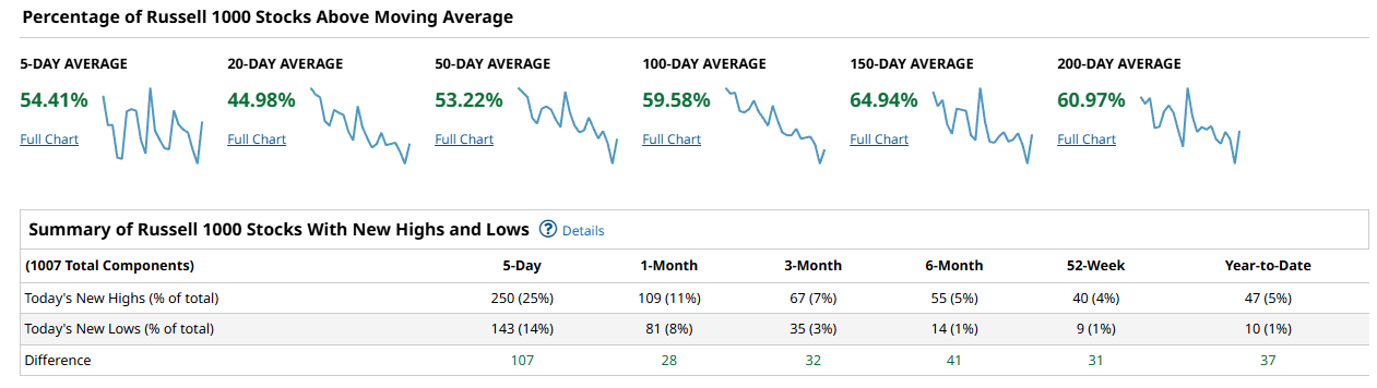 The Russell 1000 sent the clearest broad-market signal. Participation improved on the front end with 54.41 percent above the 5d and 44.98 percent above the 20d, while the 50d cohort held at 53.22 percent. Longer measures remain constructive with 59.58 percent above the 100d, 64.94 percent above the 150d, and 60.97 percent above the 200d. New highs beat new lows decisively: +107 over 5 days, +28 over 1 month, +32 over 3 months, +41 over 6 months, +31 over 52 weeks, and +37 year to date. That says the advance is not just a megacap story and that underlying repair continues to spread through the large-cap universe.