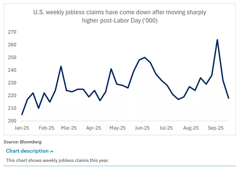 The constructive counterpoints are straightforward. GDP was revised up to +3.8% for Q2. Personal income and spending beat. Core PCE is printing +0.2% m/m and +2.9% y/y. Jobless claims fell to 218k, continuing claims sit at 1.926 million. Housing stabilized and even accelerated in new home sales. Abroad, Europe closed the week in better shape, and even with Asia mixed, the global backdrop remains more balanced than it felt in late spring.
