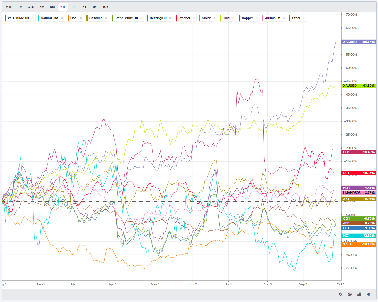 Metals were bid across the board. Gold printed a new all-time high near ~$3,800 and finished the week higher by +$26 at $3,798/oz. Silver gained nearly +10%. Copper advanced after Freeport declared force majeure at its Indonesian mine following an accident earlier in the month.