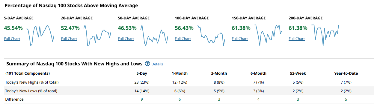 The Nasdaq 100 showed leadership that is still selective rather than broad. Near-term breadth is mixed with 45.54 percent above the 5d, but a better 52.47 percent above the 20d. The 50d sits at 46.53 percent, while the longer averages are sturdier with 56.43 percent above the 100d and 61.38 percent above both the 150d and 200d. Net new highs are positive but modest: +9 over 5 days, +6 over 1 month, +3 over 3 months, +4 over 6 months, +3 over 52 weeks, and +5 year to date. That profile fits a market where a handful of heavyweights keep the index resilient, but the intermediate cohort has not yet joined decisively. A sustained drive that lifts the 50d above 60 percent would be the clean confirmation that participation is widening beyond the marquee names.