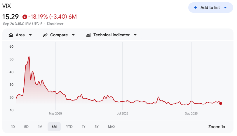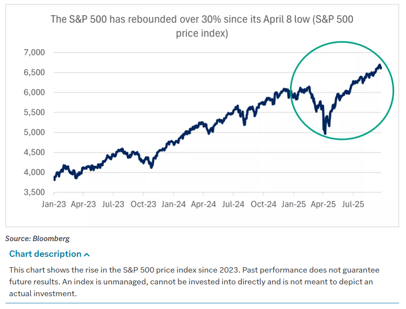 The market has absorbed a lot quickly. From the April lows, the S&P 500 is up more than +30% without a 2% or greater pullback. That does not preclude further gains—momentum can feed on itself—but it raises the probability of a garden-variety 5%–10% reset. We are in a seasonally choppier window, the data calendar has air pockets before earnings season, and a government shutdown remains on the table for October 1. None of those is thesis-breaking on its own, but together they increase the odds that the next few weeks deliver two-sided trade.