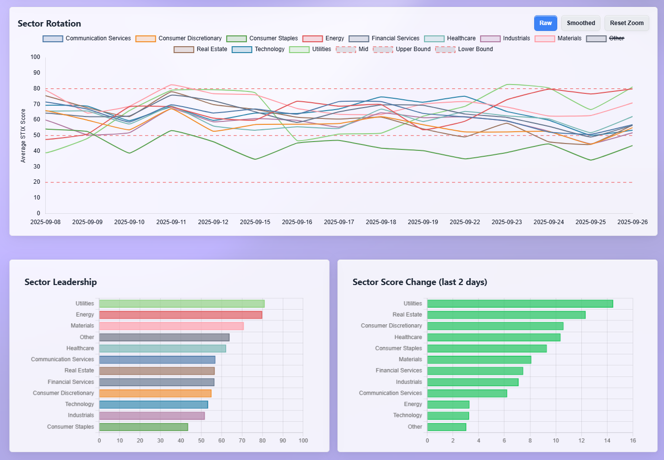 Sector leadership and the 1–2 day momentum board fit that flow. Utilities sat on top of the leadership stack with Energy next, followed by Materials and a mid-pack cluster of Healthcare, Communication Services, Real Estate, and Financials. Over the last two sessions, Utilities and Real Estate showed the biggest positive inflections, with Consumer Discretionary and Healthcare also improving. Technology’s short-term score perked but lagged the defensives’ jump, while Communication Services drifted lower on the two-day change. That combination—defensives gaining momentum, real estate perking, and energy holding high ground—maps to a market triangulating rates and growth without abandoning the AI complex. It also gels with the sweep interest in LQD and the dark-pool heaviness in index wrappers and megacap platforms. All sectors saw healthy lifts into the end of the week.