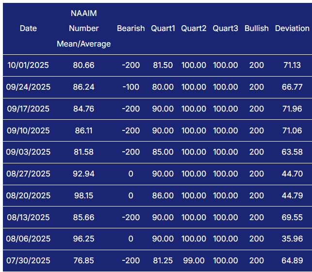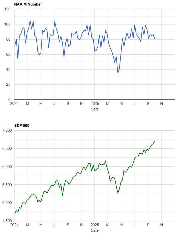 Active managers report 80.66 this week, down from 86.24 and 84.76 in the prior two readings and below late-August highs in the mid- to upper-90s. Positioning is constructive but not maxed, implying some dry powder remains while also leaving the market somewhat exposed to de-risking if prices wobble. A drop into the 50s without material index damage would flag stealth distribution and raise drawdown risk; conversely, a push back into the 90s would indicate chase-mode and make the tape more sensitive to disappointments.