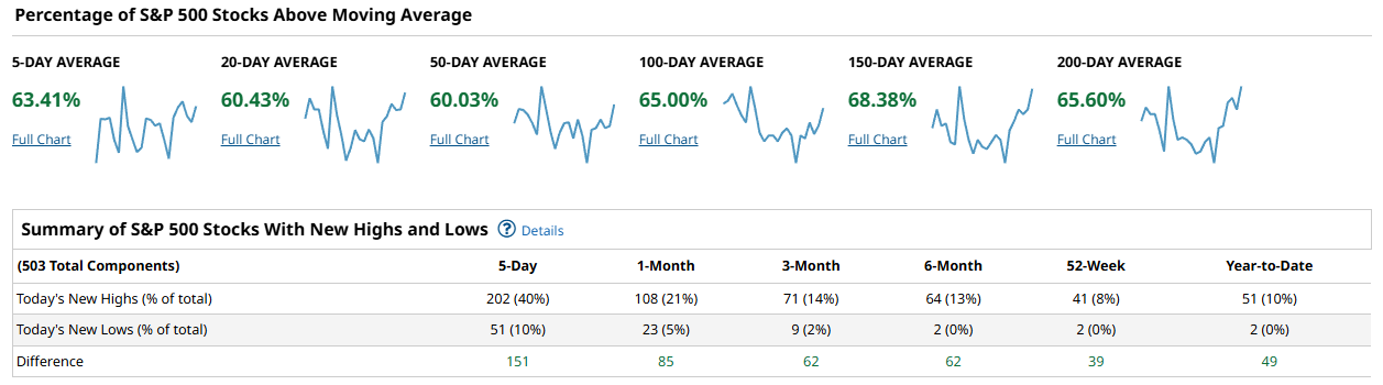 Bottom line: breadth is supportive and broadening, with new highs firmly ahead of new lows and the 50–200 day cohorts aligned for trend continuation.
