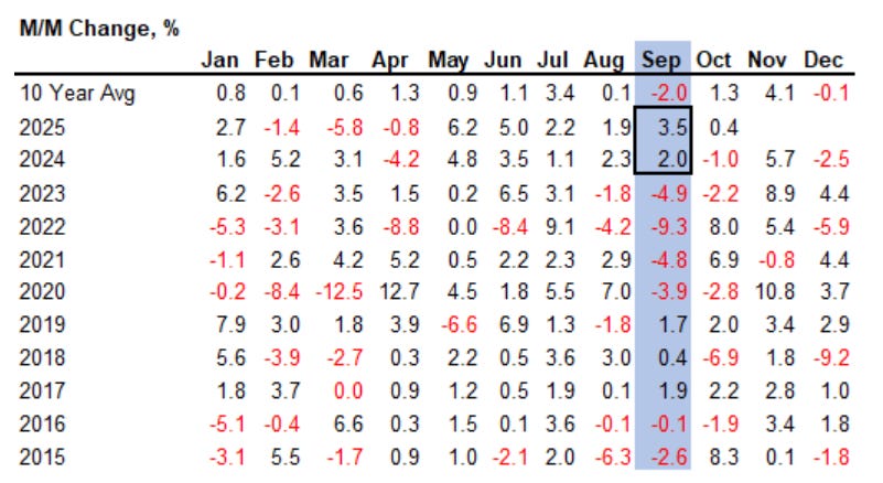 This week closed September and opened the fourth quarter. Seasonally, September has been the weakest month over the last decade, down an average of 2%. Not this time. The S&P 500 rose 3.5% in September, the second straight year of solid September gains, and is now up 14% year-to-date after rising more than 20% in each of the last two years. October and November are historically strong months, and the question now is whether a 20% “trifecta” is possible again if the AI bid continues to lift multiple sectors and the Fed keeps the gears greased for rate cuts.