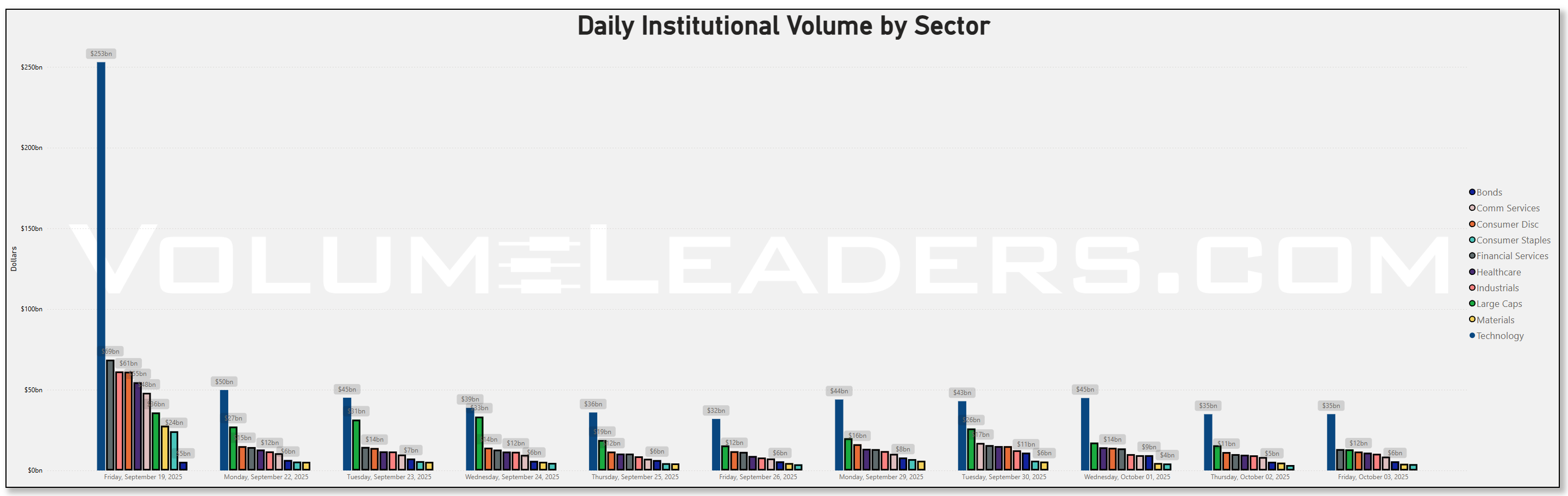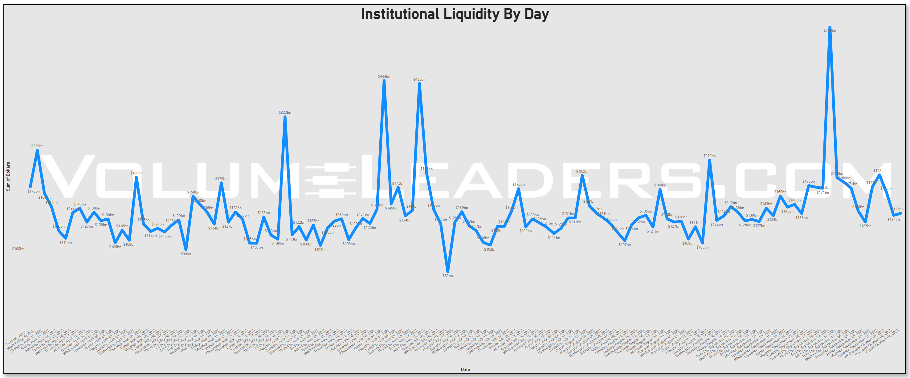 The multi-month tape of institutional dollars shows a series of periodic surges with a standout spike late last month that towers over the surrounding prints, consistent with triple witching, index reweightings, and the roll into a new month. Those bursts are structural: they recur on a roughly four- to five-week cadence and fade back into a $120–$170b daily rhythm afterward. That pattern lines up with what we know about scheduled rebalancing and window-dressing, which can mechanically pull large flows across stocks, bonds, and ETFs without necessarily signaling a durable directional bet. Academic and industry work finds such calendar rebalancing is sizable and repeatable, with measurable next-day price effects as funds move back to targets.