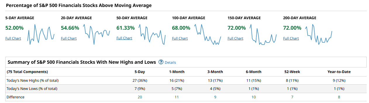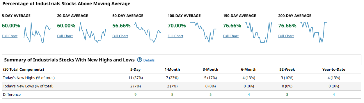 The Dow Jones Industrial Average, with its 30 names, shows surprisingly strong intermediate-term participation. Above-MA readings print 60.00% on the 5-day, 60.00% on the 20-day, 56.66% on the 50-day, 70.00% on the 100-day, 76.66% on the 150-day, and 76.66% on the 200-day. New highs swamp lows at every lookback: 11 vs 2 over 5 days (+9), 7 vs 2 over 1 month (+5), 5 vs 0 over 3 months (+5), 4 vs 0 over 6 months (+4), 3 vs 0 on 52-week (+3), and 4 vs 0 year-to-date (+4). The Dow’s heavier 150–200 day readings signal mature uptrends across many components; the short end is fine, not frothy. That mix supports a steady rather than explosive tape.