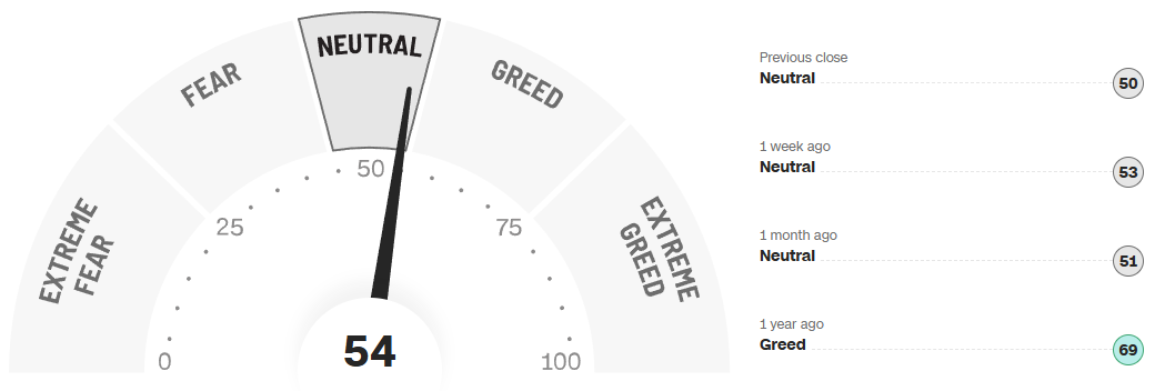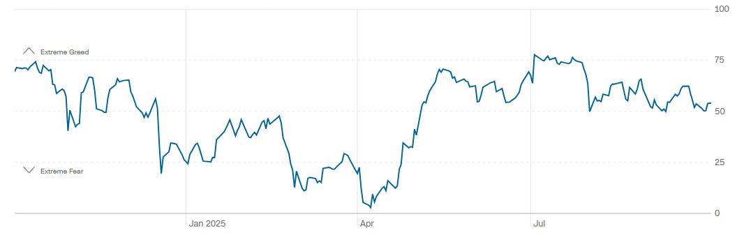 The composite gauge prints 54, up from 50 at the previous close, 53 a week ago, and 51 a month ago; a year ago it was higher at 69. The 1-year path shows a surge toward the 70s in early summer, followed by a cooling into a mid-range, mostly 50s-60s band. That is a balanced backdrop: neither pessimism to power a major squeeze nor exuberance that typically precedes air-pockets. Above ~80 would flag exhaustion risk; a drop toward the low-30s would mark a better entry window for fresh risk.