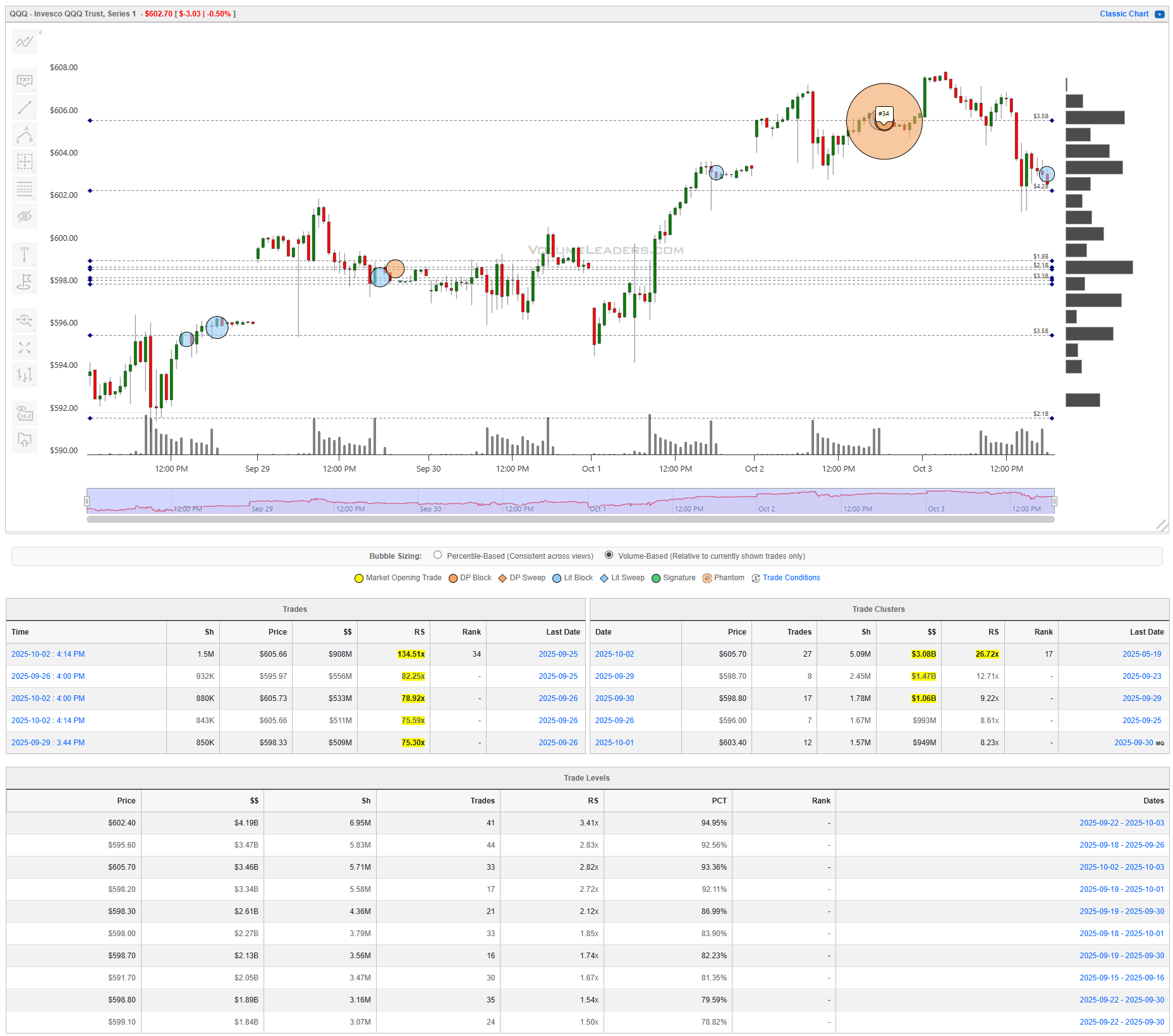 Tech stayed constructive but rotational. The biggest single prints were $605.66 for $908M (RS 134x), $595.97 for $556M (RS 82x), and $605.73 for $533M (RS 79x), showing real size defending the $605 handle and opportunistic activity on dips toward the high-$590s. Clusters are dominated by $605.70 with $3.08B (RS 26.7x), while the $598.70–$598.80 zone holds another $2.1–$1.5B each (RS 9–13x). Levels stack tightly: $602.40 ($4.19B, RS 3.41x, 94.9% PCT) and $605.70 ($3.46B, RS 2.82x) overhead, with support through $598.20–$598.90 ($2.6–$3.3B) and a pivot at $595.60 ($3.47B, RS 2.83x). The line of scrimmage is $602–$603…you can simplify by using the week’s close. Regain and hold above that band and the tape should probe $605.7; rejection there resets the magnet back to $598s. Bulls want acceptance above $605.7 with clusters flipping to support; bears want lower highs under $602 that press into $598.2. Entries framed around $602 with clear stops either side will keep risk tight; first targets sit $605.7 above and $598.7 below.