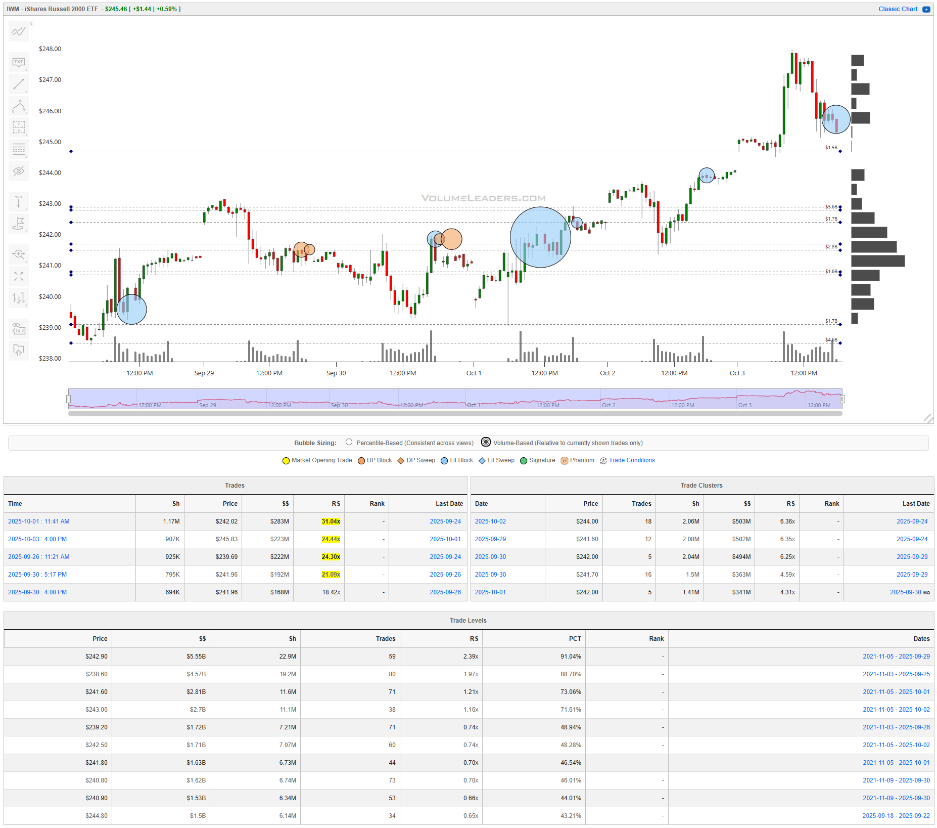 Small caps showed the strongest impulse, then cooled into late-week. Notable blocks printed at $242.02 for $283M (RS 31x), $245.83 for $223M (RS 24x), and $239.69 for $222M (RS 24x), a nice spread that built a fresh ladder of sponsorship. The clusters are unusually even: $244.00 carries $503M (RS 6.36x), $241.60 holds $502M (RS 6.35x), and $242.00 carries $494M (RS 6.25x). Levels confirm a broad platform: $242.90 is the standout with $5.55B (RS 2.39x, 91.0% PCT) and $238.60 with $4.57B (RS 1.97x, 88.7%). The line of scrimmage is the $242–$243 pocket. Acceptance above $243 and the market can re-lean into $244–$246; lose $242 and a rotation into $241.60 and $239.20 ($1.72B) is on deck. For continuation, look for buyers to defend $242.5 on dips; a clean break of $239.2 would negate the near-term uptrend. Intraday, lean against $242.9 with defined stops for longs, or fade into $244 failure with targets back to $242.5 and $241.6.