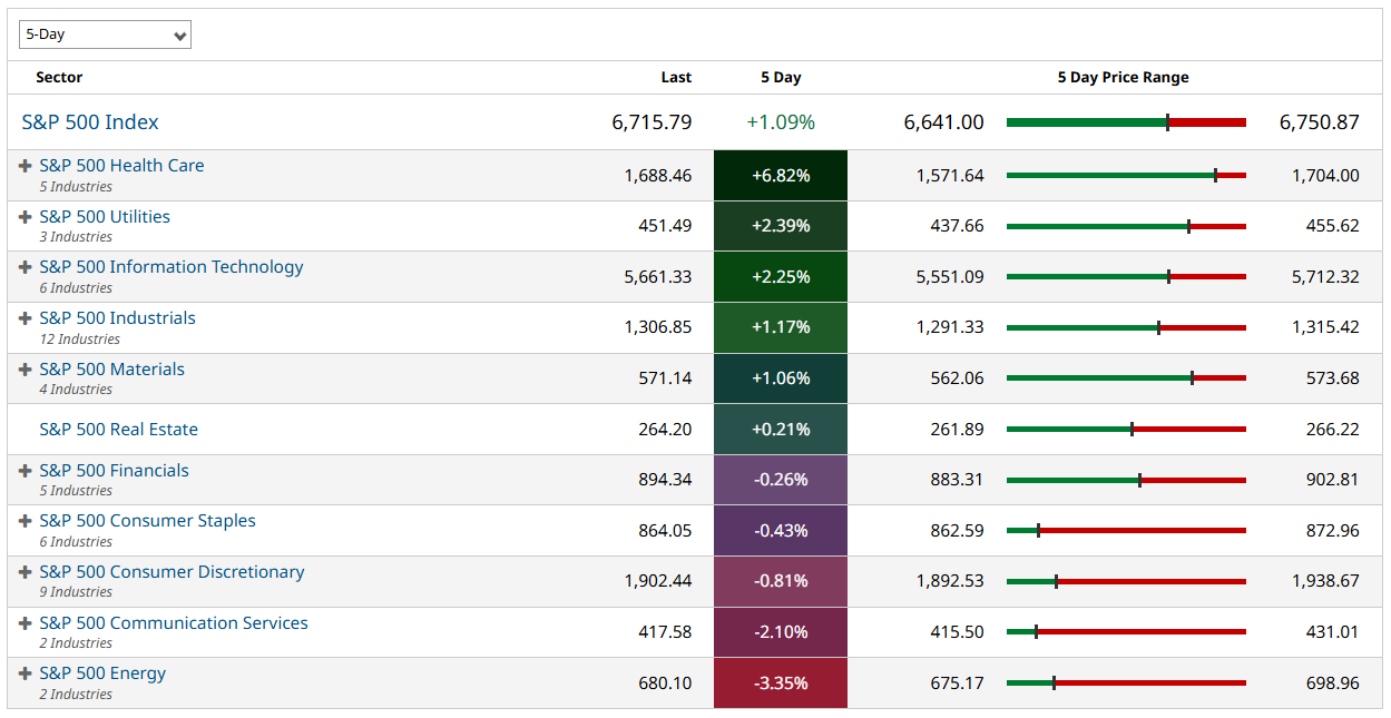 Healthcare outperformed decisively into week’s end and through the weekly ranking. Humana (HUM) jumped more than +10% Friday, adding to Thursday’s +4%, after reaffirming 2025 earnings guidance. That strength rippled across managed care, with Centene (CNC) up more than +5% and Cigna Group (CI) up more than +4%. Molina Healthcare (MOH) and Elevance Health (ELV) rose more than +3%, and UnitedHealth Group (UNH) added more than +1% to help the Dow. Outside managed care, Fair Isaac (FICO) climbed more than +3% after Thursday’s +17% surge on its decision to sell credit scores directly to mortgage resellers.
