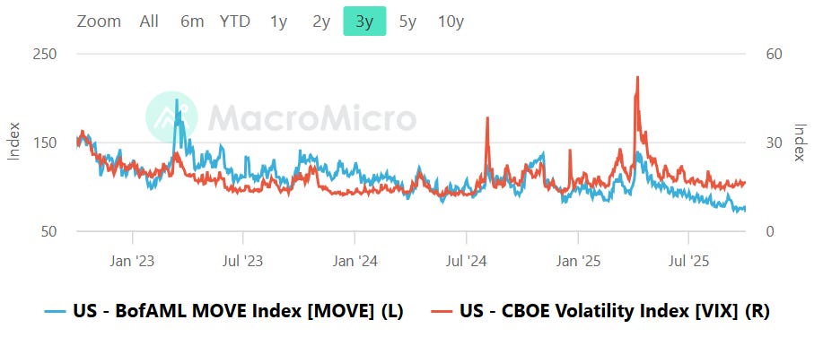 The snapshot does not provide a precise numeric read, and no obvious spike is evident. In this regime the signal is neutral: neither market is clearly warning of cross-asset stress. The tripwires remain straightforward. If MOVE were to jump above roughly 120 while VIX stays subdued, that divergence would often precede equity volatility. Alternatively, if VIX itself pressing into the high teens or higher while MOVE remains calm, treat it as a direct risk-off cue for equities.