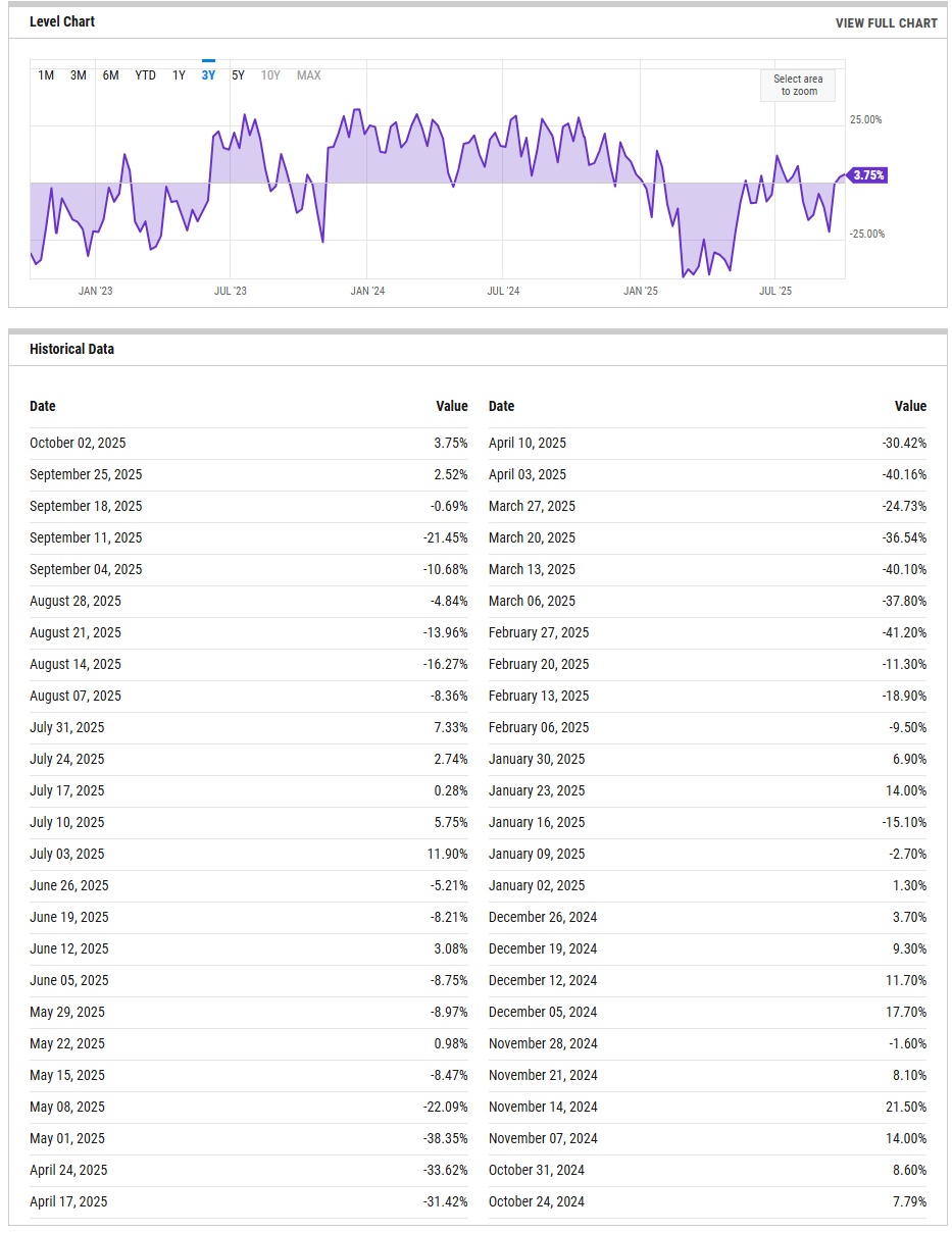 The bull-bear spread sits at 3.75% as of Oct 2, up from 2.52% last week and rebounding from mid-September negatives (e.g., -21.45% on Sep 11 and -16.27% on Aug 14). That is mild optimism, not euphoria. Historically, sub-zero tends to be supportive for rebounds, while sustained readings north of roughly 20% get crowded. A decisive push above the mid-teens would start to compress forward returns; slipping back below zero would say sentiment tailwinds have faded and the tape is vulnerable to headline shocks.