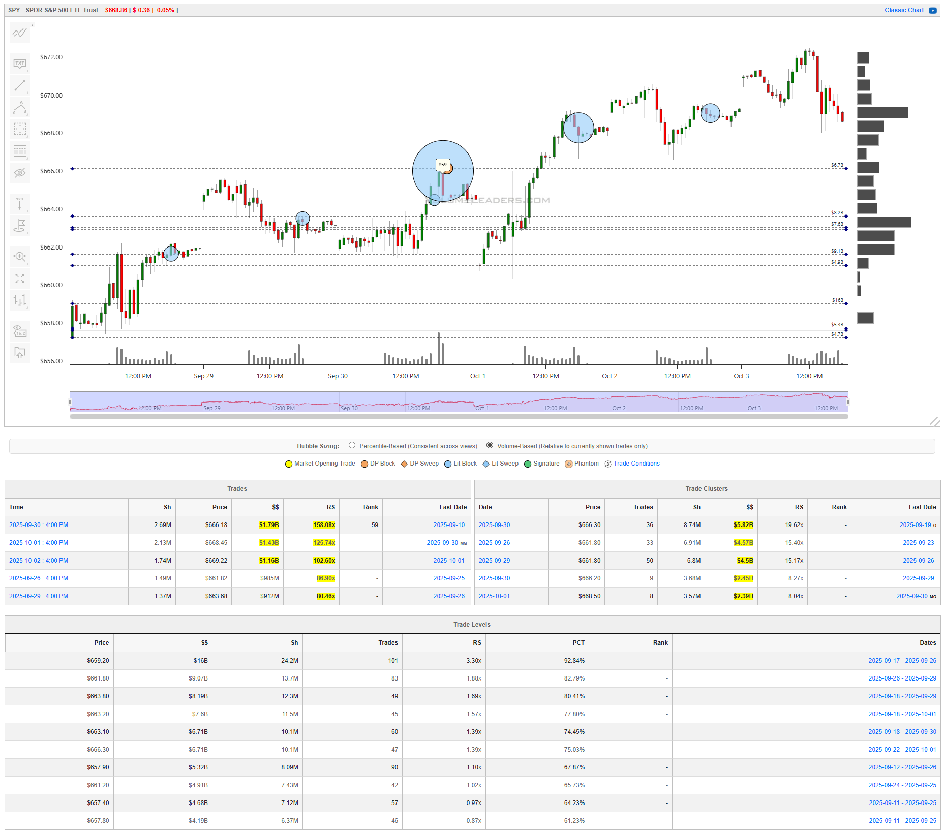 The week built a rising structure that pulled back into Friday. The most revealing prints sat in the mid-660s: three outsized blocks hit at $666.18, $668.45, and $669.22 with notional of $1.79B, $1.43B, and $1.16B, each carrying triple-digit RS (158x, 126x, 103x). A top-100 ranked trade fired earlier in the week, underscoring how aggressively buyers engaged near the first launch out of balance. The heaviest cluster for the window sits at $666.30 with $5.82B traded (RS 19.6x), followed by a twin cluster at $661.80 totaling roughly $9.1B combined (RS ~15–16x). The level stack is equally clear: $659.20 ($16B, RS 3.30x, 92.8% PCT) anchors support, with a dense band from $661.80–$663.80 ($9.07B–$8.19B). The line of scrimmage is $666.30. Hold above and the upper shelves at $668.50 and the week’s highs can re-magnetize; lose $666 and price invites a test of $663s, then $661.8 and finally $659.2. For the next sessions, a bullish path is acceptance back above $666.30 that converts the $668s cluster into a springboard; confirmation is sustained trade above $668.5 with dwindling responsive selling. The bearish path is failure at $666.30 that drives into the $663s band; continuation is a clean break of $661.8 that opens $659.2. Tactically, fade tests into $666.30 only if sellers show impulsivity and the buying remains contained; otherwise buy back-test holds of $666 with tight invalidation beneath $665.8 and first targets $668.3–$668.5.