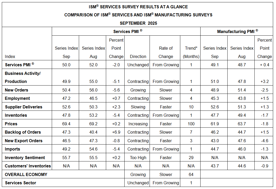 A softer services read complicated the picture: the September ISM services index fell -2.0 to a 4-month low of 50.0 versus expectations for 51.7, while the ISM services price paid sub-index unexpectedly ticked up +0.2 to 69.4 versus consensus for 68.0. The combination—slower activity and firming service-sector prices—clipped some of the early equity enthusiasm and pressured bonds, and by the close equities churned into a flat-to-mixed finish. Layer on top the third day of a U.S. government shutdown and the tape’s hesitation made sense.