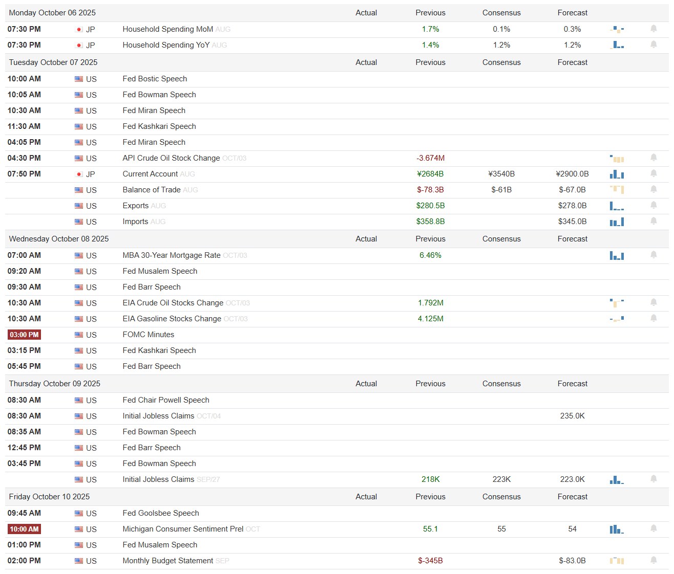 A quiet U.S. session, but Japan sets the overnight tone with a firmer consumer pulse. Household Spending rose 1.7% m/m and 1.4% y/y, both better than the prior baselines shown, a small global growth tailwind. Risk-on if Asia follows through with higher equities and a firmer yen, since that cools imported inflation and steadies carry. No U.S. data or Fed speakers on deck, so index levels will lean on positioning and commodity cues into Tuesday.