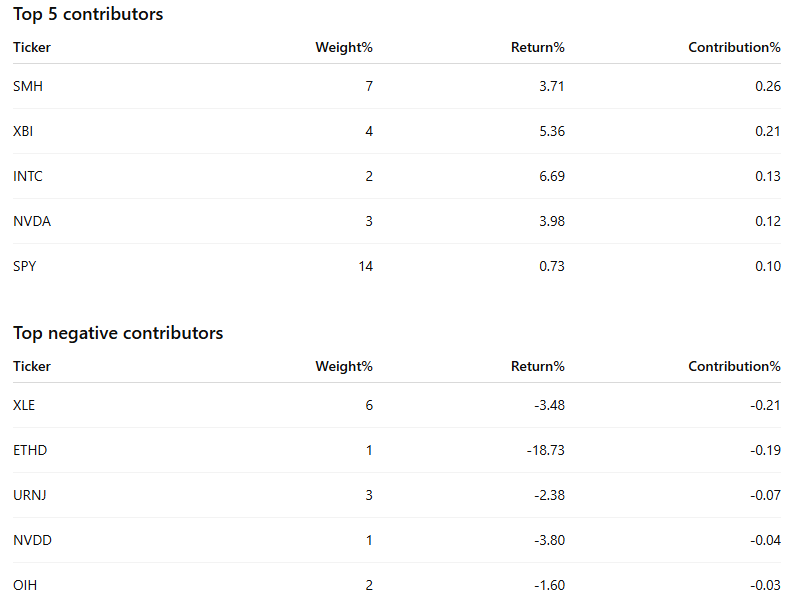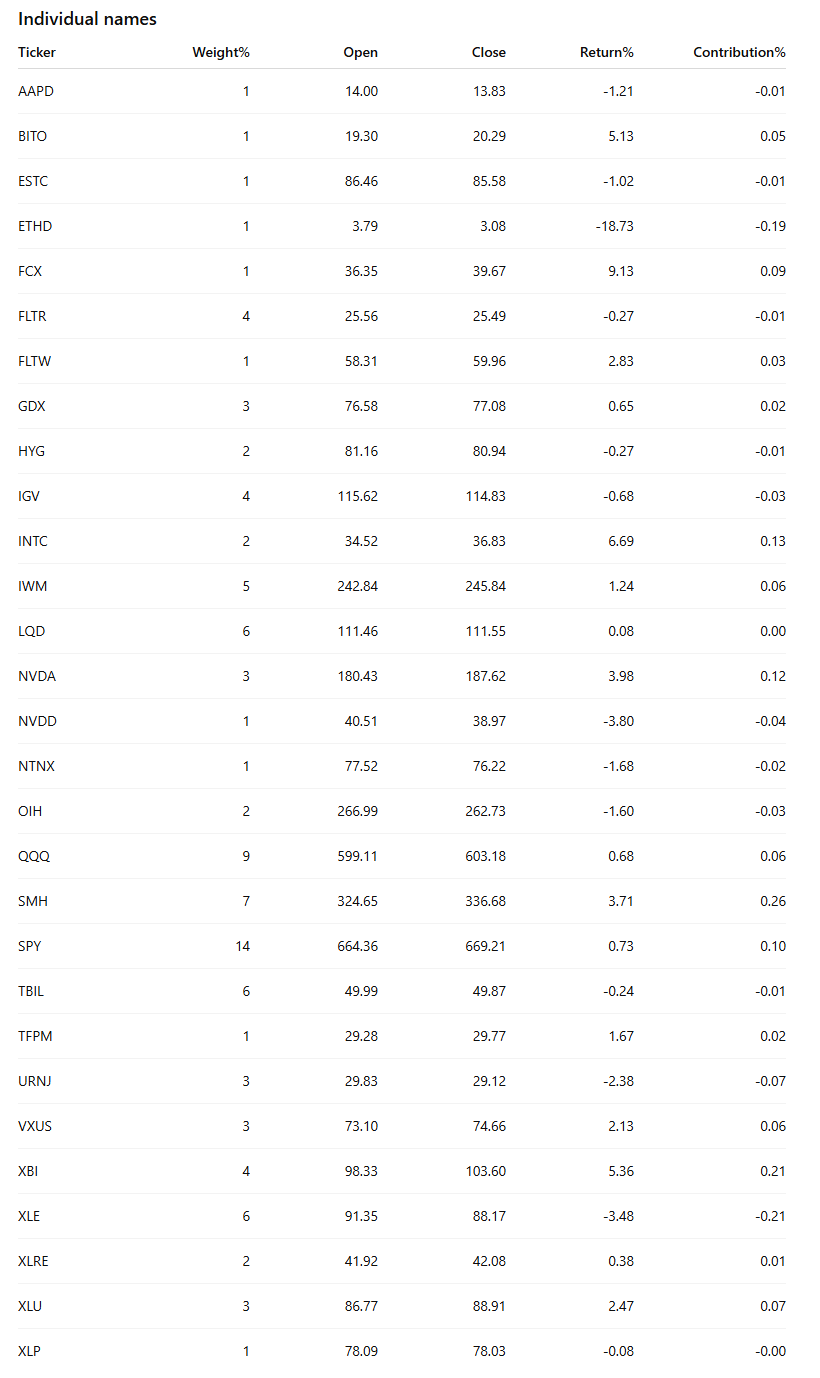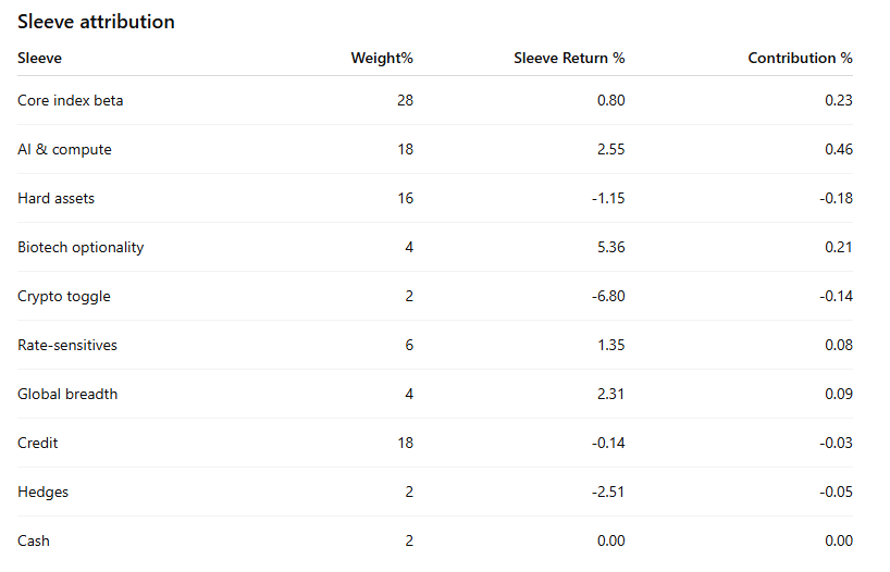 Why this mix works this week? Core wrappers and credit do the heavy smoothing while QQQ/semis capture upside in the still-sponsored AI complex. XBI and a tiny MRUS give us convexity without over-concentrating single-name risk. The miners sleeve offsets macro and policy surprises and has been attracting real dollars; it should work if yields pop or growth jitters return. Defensives and REITs reflect the steady re-risking in utilities/real estate we saw on the IO tape and give us carry if momentum pauses. Energy beta stays intentionally small until we see rotation back into services leadership. Crypto remains a toggle, sized to matter but not to drive the P&L.