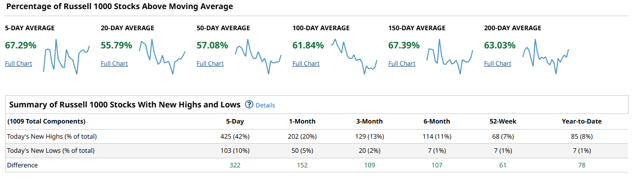 The Russell 1000 tells the breadth story best: participation is broad and improving. Members above their moving averages run at 67.29% on the 5-day, 55.79% on the 20-day, 57.08% on the 50-day, 61.84% on the 100-day, 67.39% on the 150-day, and 63.03% on the 200-day. New highs decisively beat new lows across the board: 425 highs vs 103 lows over 5 days (+322), 202 vs 50 over 1 month (+152), 129 vs 20 over 3 months (+109), 114 vs 7 over 6 months (+107), 68 vs 7 on 52-week (+61), and 85 vs 7 year-to-date (+78). Those figures argue that the advance is not just a mega-cap story; the broader large-cap universe is participating, with the 50- and 100-day cohorts either side of 60% and rising.