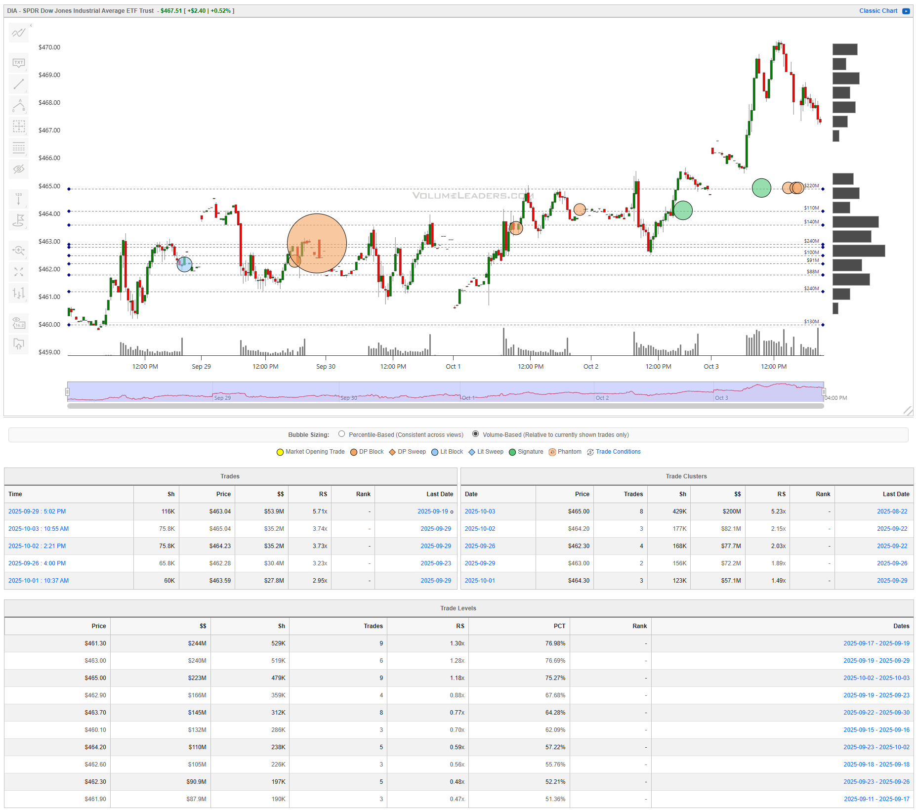 The Dow’s ramp was orderly with late pullback and no levels developing at the highs. The biggest prints were modest in absolute size but meaningful in context: $463.04 for $53.9M (RS 5.71x), $465.04 for $35.2M (RS 3.74x), and $464.23 for $35.2M (RS 3.73x). The dominant cluster sits at $465.00 with $200M (RS 5.23x); nearby bands at $464.20 ($82.1M) and $462.30 ($77.7M) round out the ladder. Levels are layered every dollar: $461.30 ($244M, RS 1.30x, 77.0% PCT), $463.00 ($240M), and $465.00 ($223M) form a tidy staircase. The line of scrimmage is $463. A hold and turn there sets up another look at $465; lose $463 and the magnet is $461.3. Confirmation for bulls is acceptance back above $465 with higher lows; bears want rejections at $463.7–$464.2 that push $462.3. Executions favor tight risk around those dollar handles with first targets one handle away.